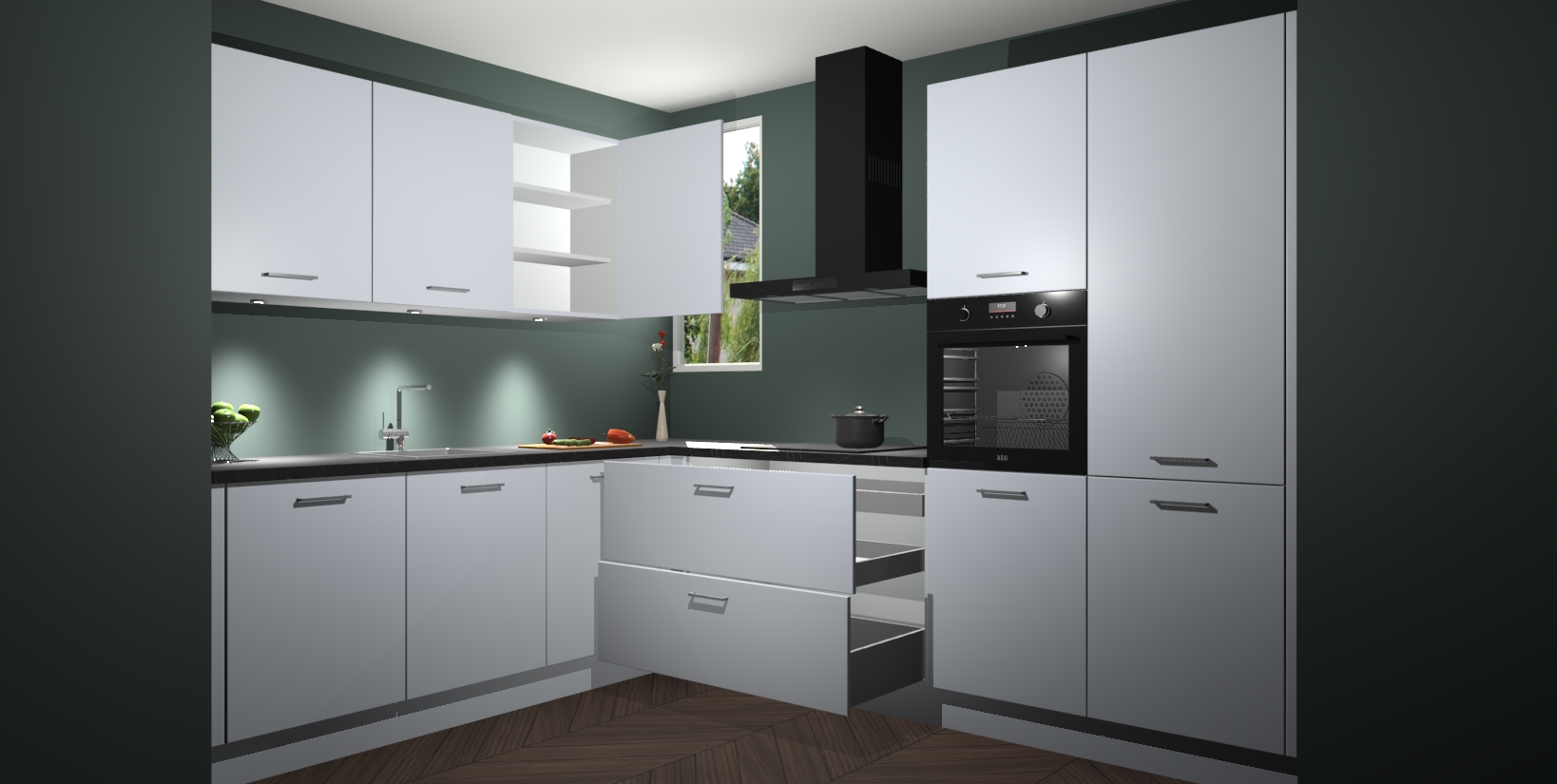 De ruime opbergruimte van dit model maakt het bereiden van voedsel en het gebruik van apparaten snel en gemakkelijk. Het beste van alles is dat het wordt geleverd met vijf inbouwapparaten: een oven, inductiekookplaat, afzuigkap, vaatwasser en koelkast - die allemaal gemakkelijk kunnen worden opgewaardeerd naar AEG na aankoop. Wat de gemaksfactor nog groter maakt, is het feit dat alle cabines voorgemonteerd worden geleverd, zodat u er meteen mee aan de slag kunt!