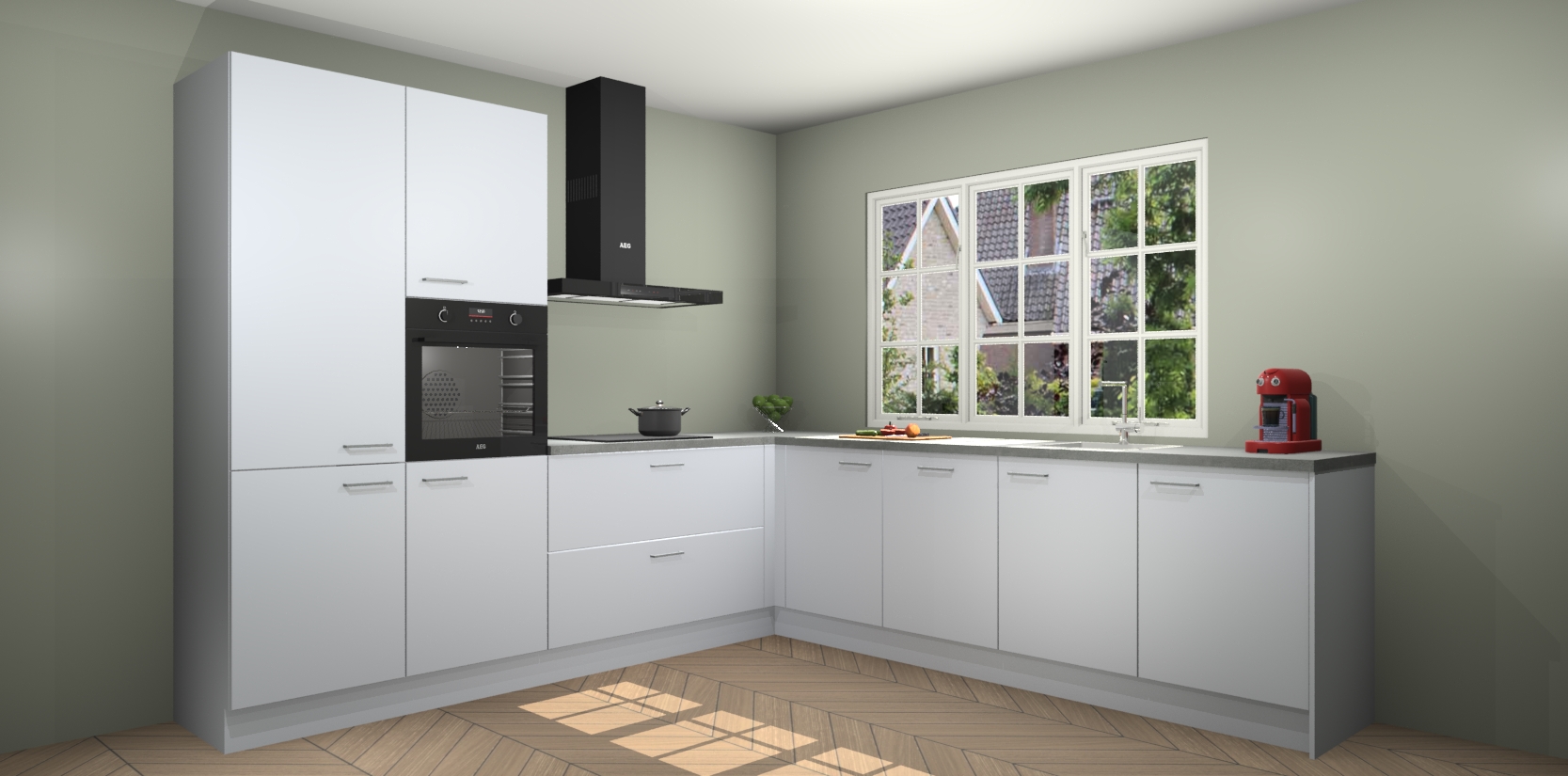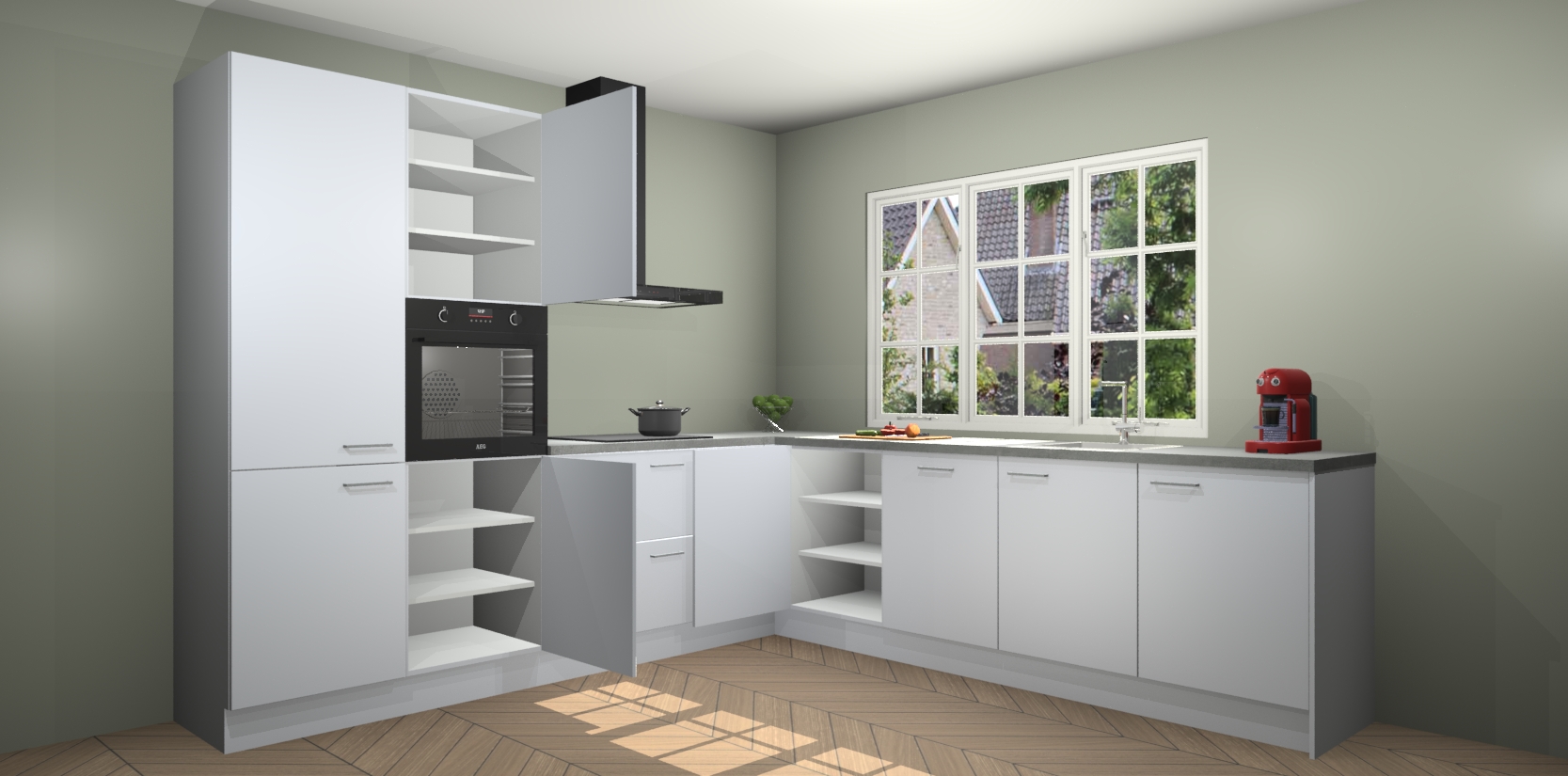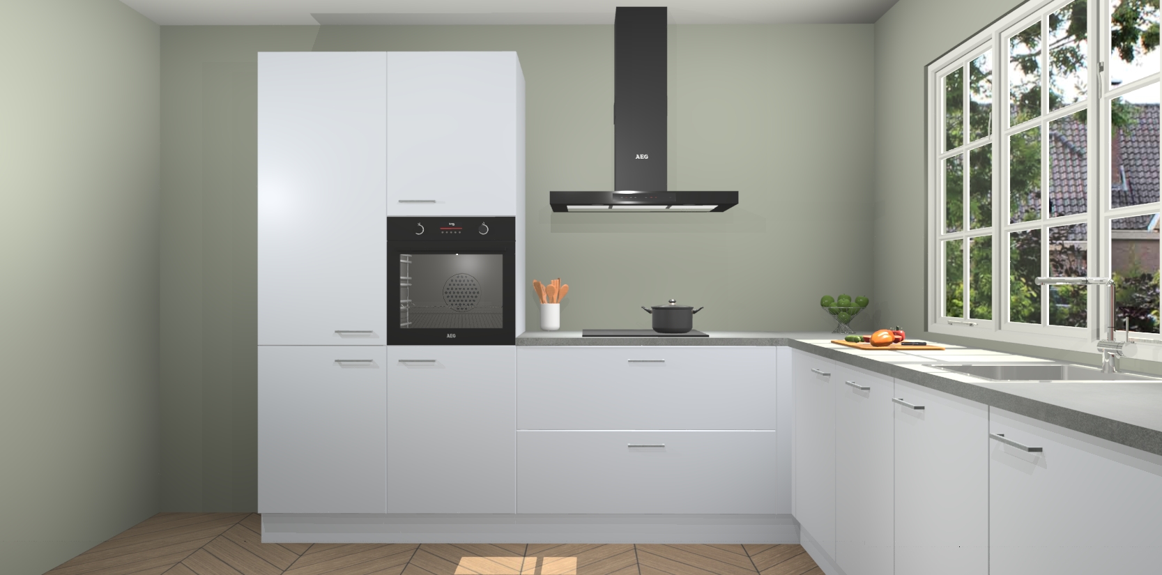 De keuken heeft veel opbergruimte, waardoor u alle ingrediënten gemakkelijk bereikbaar hebt staan. En daarnaast bevat deze volledig uitgeruste keuken ook 5 ingebouwde apparaten: een oven, inductiekookplaat, afzuigkap, vaatwasser en koelkast. Deze zijn heel eenvoudig na bestellen te upgraden naar AEG als u dit wilt. Bovendien zijn de softclose-kastdeuren ideaal; geef ze gewoon even een tikje en ze sluiten automatisch met geruisloze precisie.