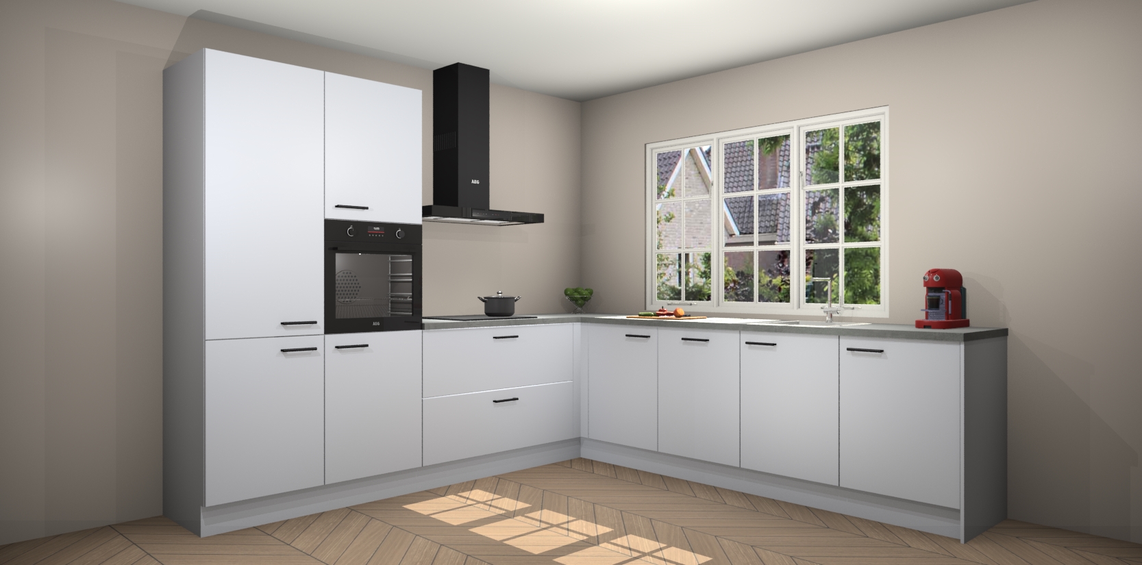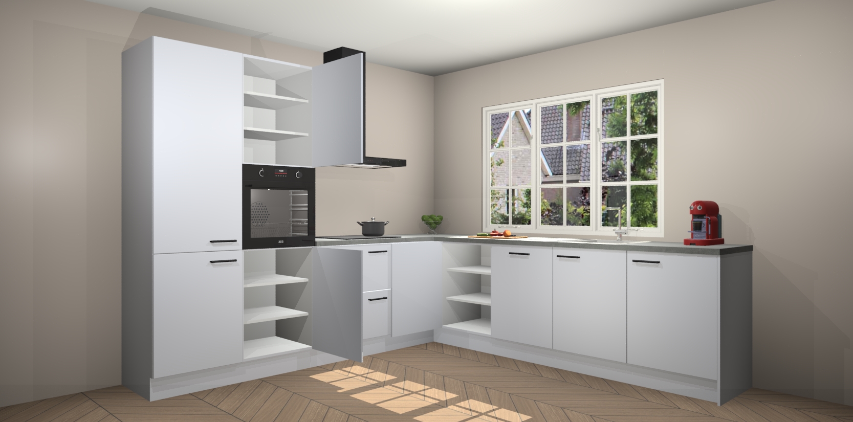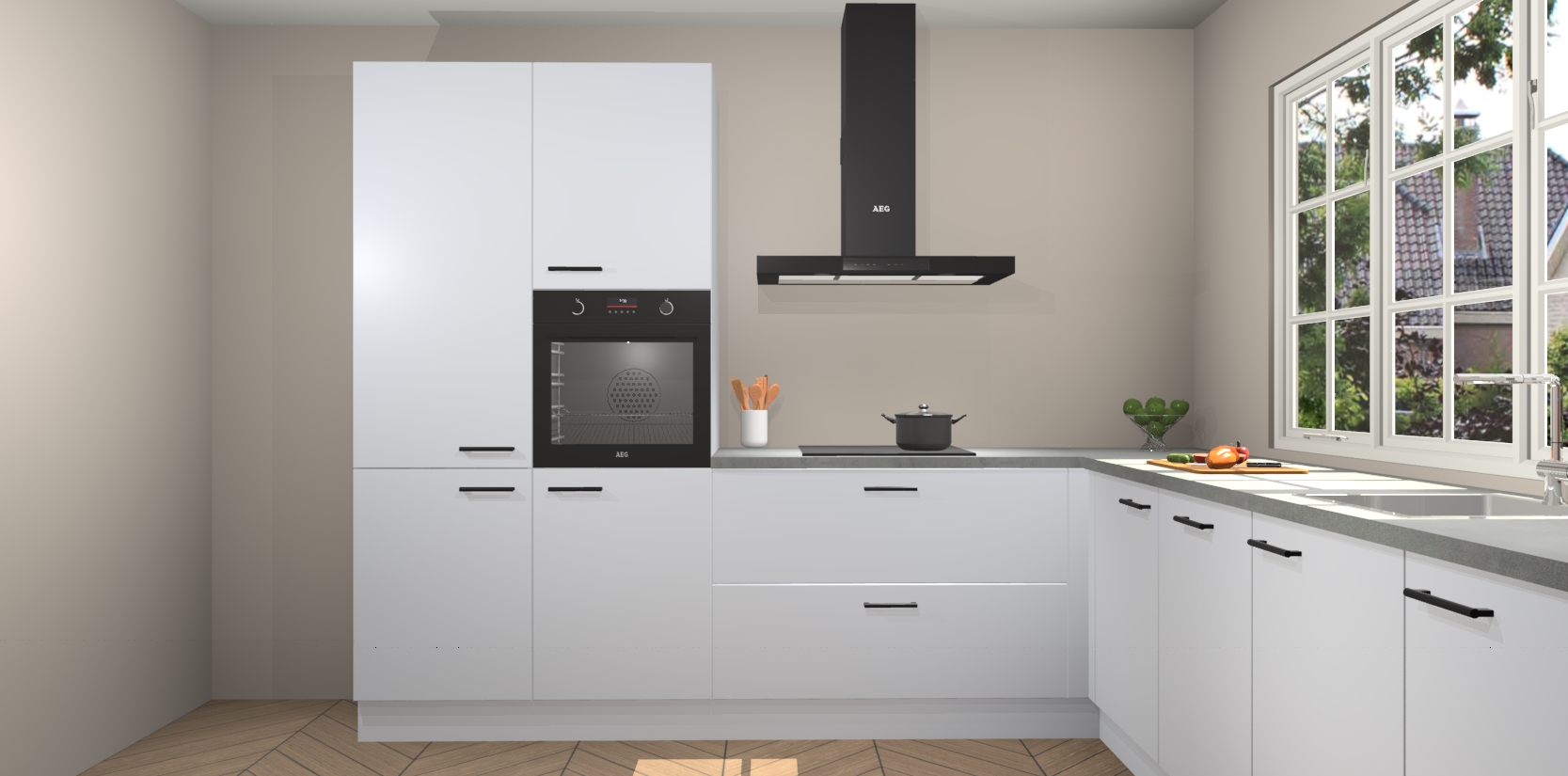 De keuken heeft veel opbergruimte, waardoor u alle ingrediënten gemakkelijk bereikbaar hebt staan. En daarnaast bevat deze volledig uitgeruste keuken ook 5 ingebouwde apparaten: een oven, inductiekookplaat, afzuigkap, vaatwasser en koelkast. Deze zijn heel eenvoudig na bestellen te upgraden naar AEG als u dit wilt. Bovendien zijn de softclose-kastdeuren ideaal; geef ze gewoon even een tikje en ze sluiten automatisch met geruisloze precisie.