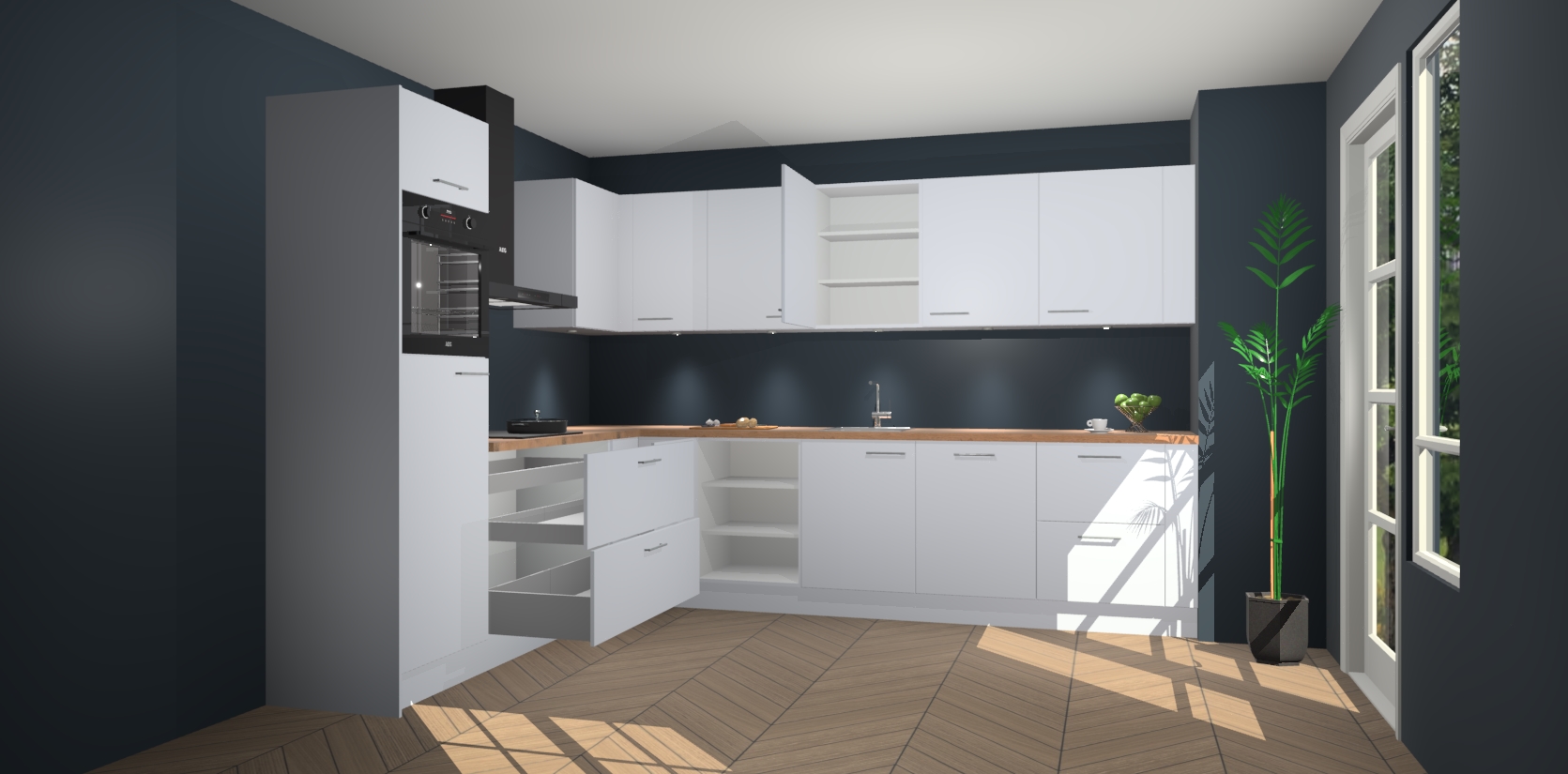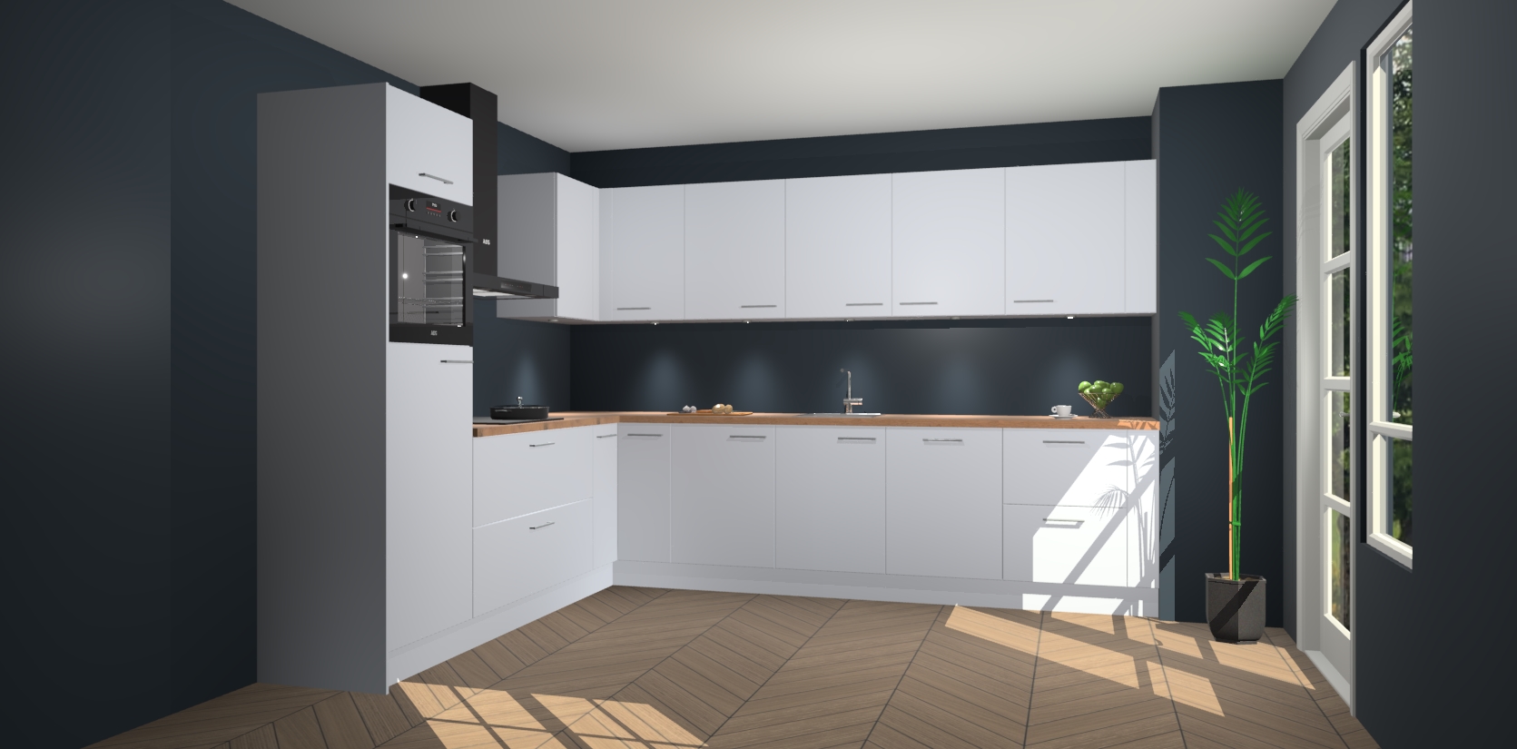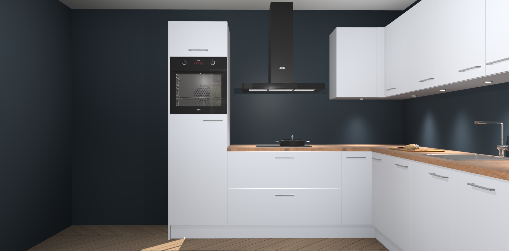 De Sneeuwwitte keuken Debar is uitgerust met vijf inbouwapparaten die elke kooktaak handig en efficiënt maken. Een oven, inductiekookplaat, afzuigkap, vaatwasser en koelkast zijn standaard, maar kunnen na bestelling eenvoudig worden geupgrade naar AEG. Profiteer vervolgens van de softclose deuren voor snelle toegang en geruisloze toegang.