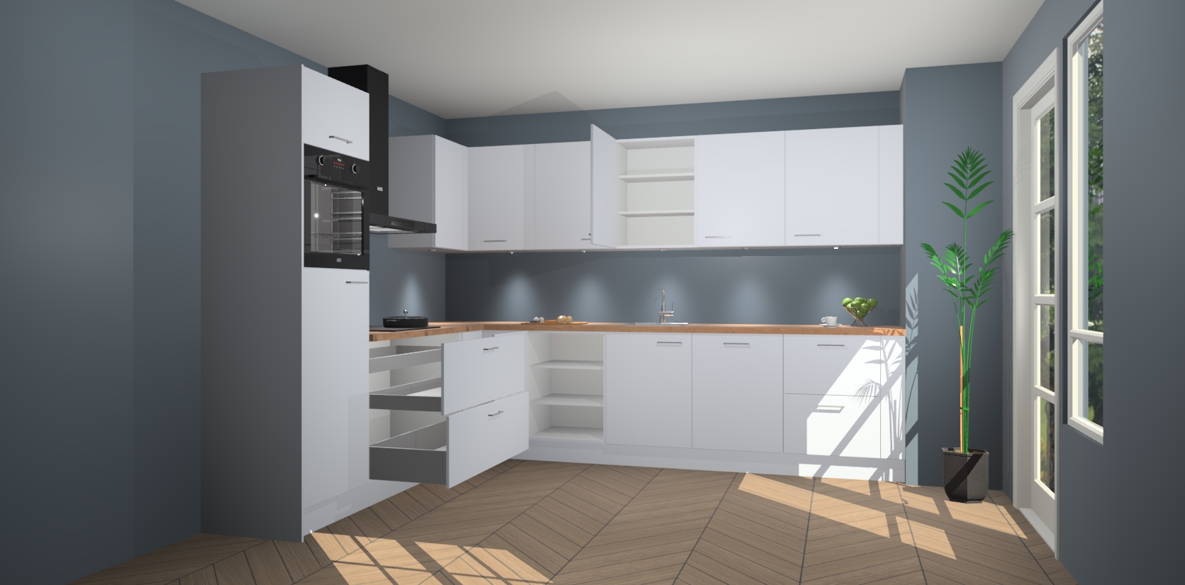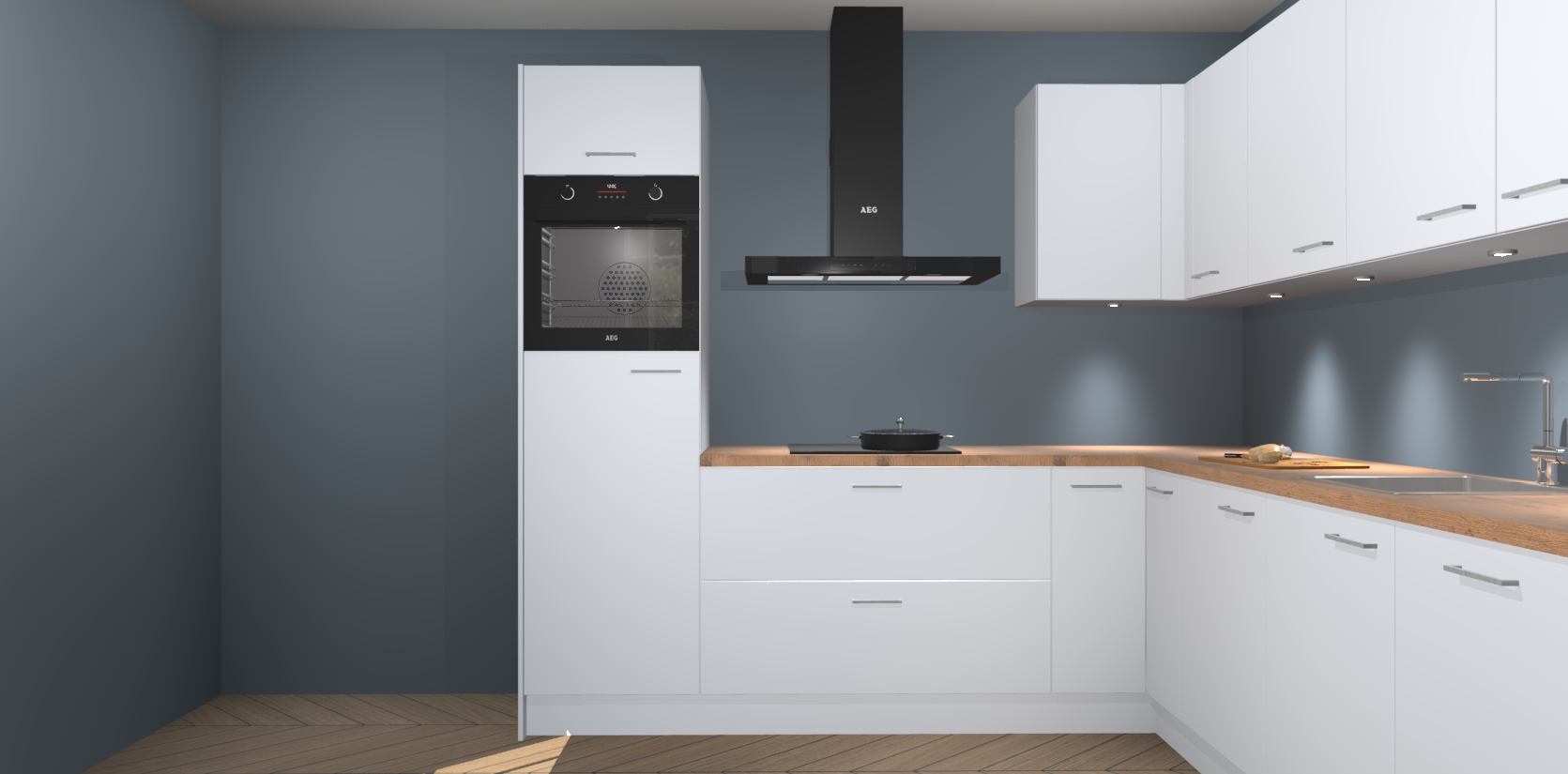 De Sneeuwwitte keuken Debar is uitgerust met vijf inbouwapparaten die elke kooktaak handig en efficiënt maken. Een oven, inductiekookplaat, afzuigkap, vaatwasser en koelkast zijn standaard, maar kunnen na bestelling eenvoudig worden geupgrade naar AEG. Profiteer vervolgens van de softclose deuren voor snelle toegang en geruisloze toegang.