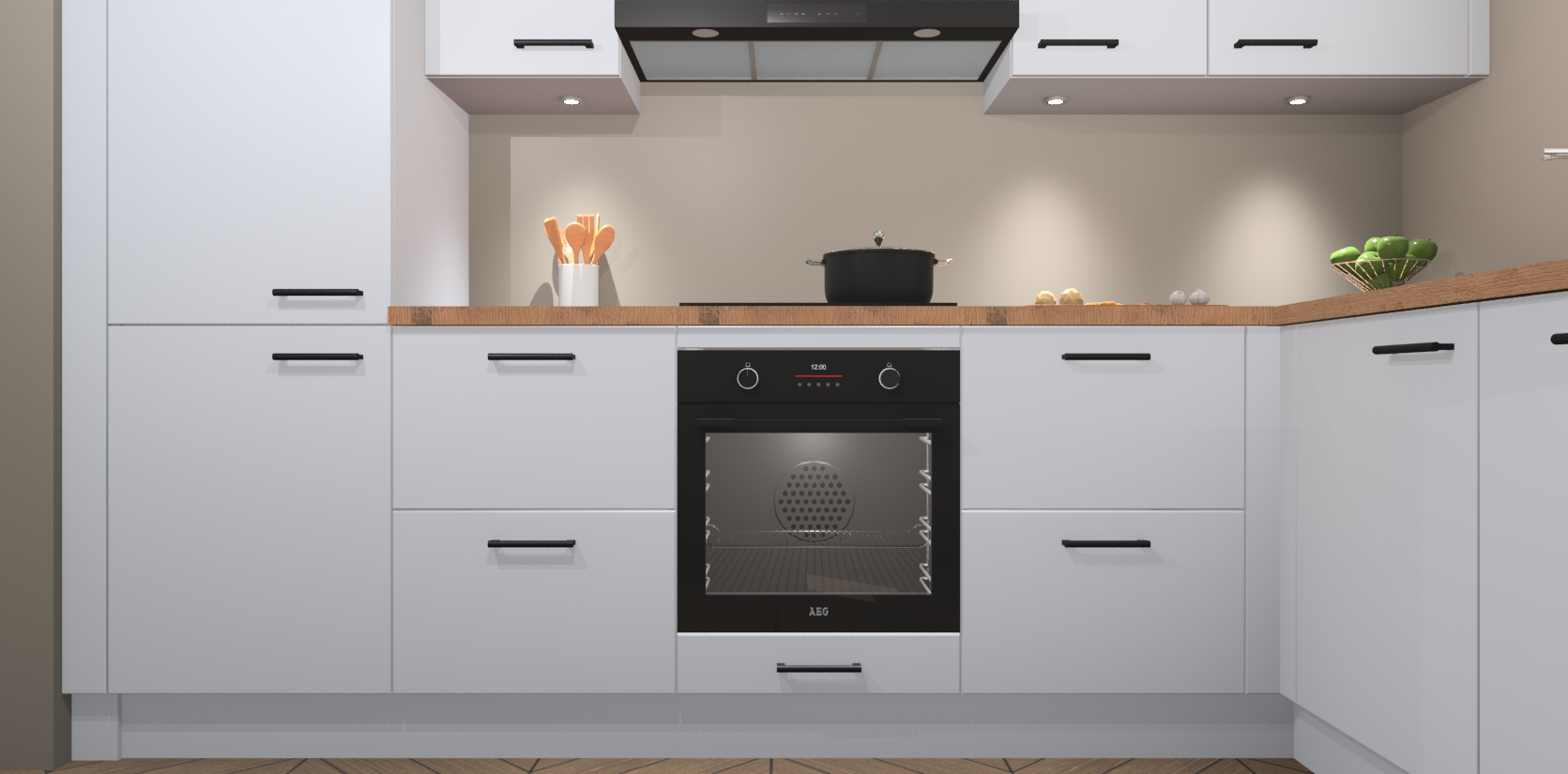 De Sneeuwwitte keuken Geneve is uitgerust met 5 inbouwapparaten - een oven, inductiekookplaat, afzuigkap, vaatwasser en koelkast - voor al uw kook- en bewaarbehoeftes. U kunt deze apparaten desgewenst eenvoudig upgraden naar AEG of de oven omruilen voor een combimagnetron na het plaatsen van uw bestelling. En met de soft close deuren, voldoende opbergruimte en kasten die voorgemonteerd worden geleverd, bent u in een mum van tijd klaar om heerlijke maaltijden te bereiden!