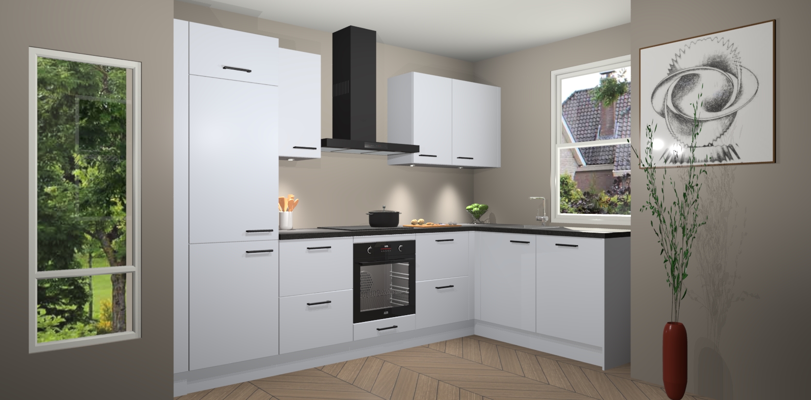 De Sneeuwwitte keuken Geneve is precies wat u nodig heeft als u op zoek bent naar modern design, versmolten met tijdloze schoonheid. De strakke afwerking voegt klasse toe terwijl het toch een uitnodigende sfeer behoudt; zeker om zowel gasten als uzelf te inspireren om in stijl te gaan koken! En nog beter, het zal uw budget niet breken - dus waarom wachten? Met de Sneeuwwitte keuken Geneve bent u verzekerd van kwaliteit zonder in te leveren op de prijs!
