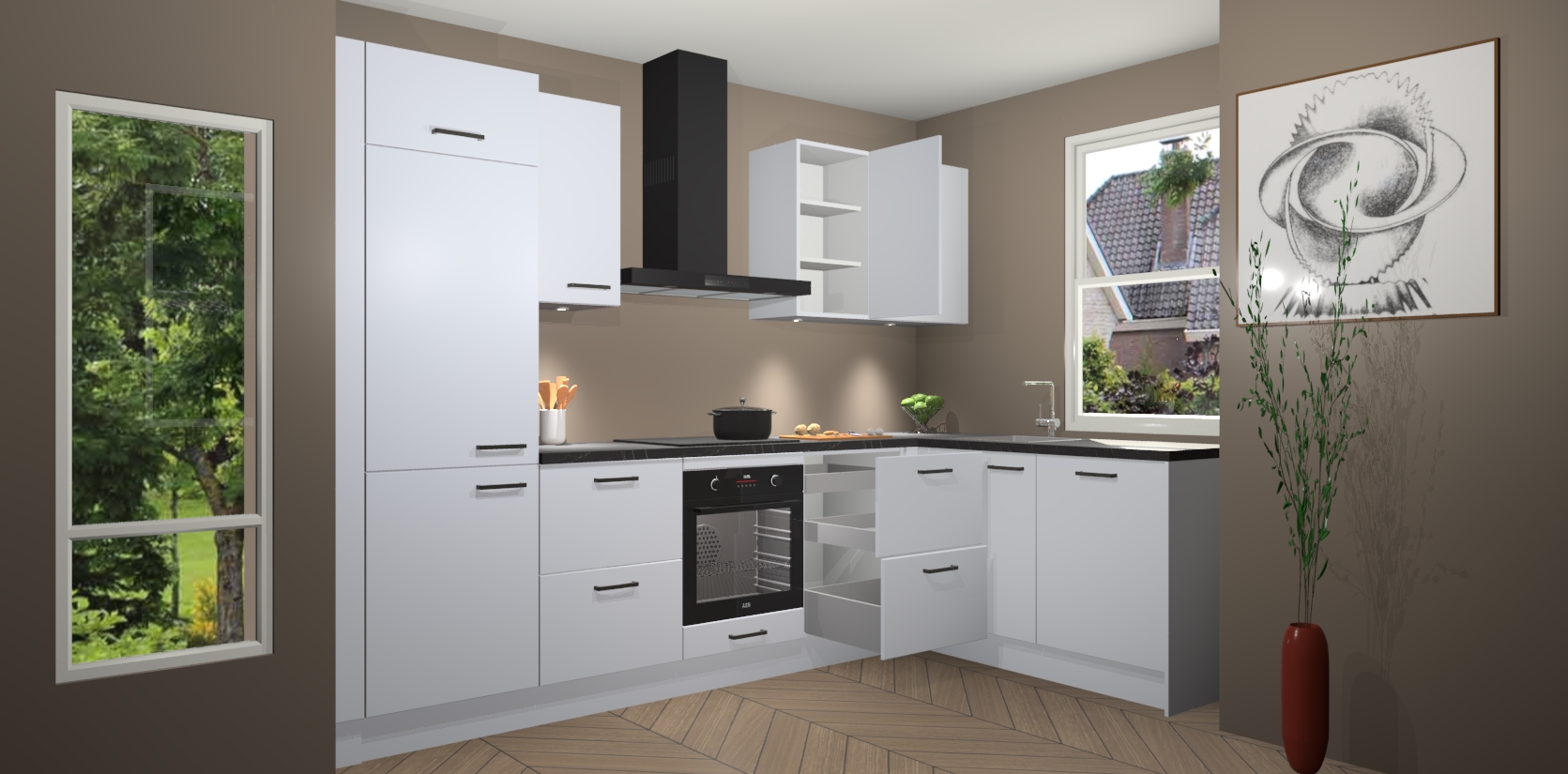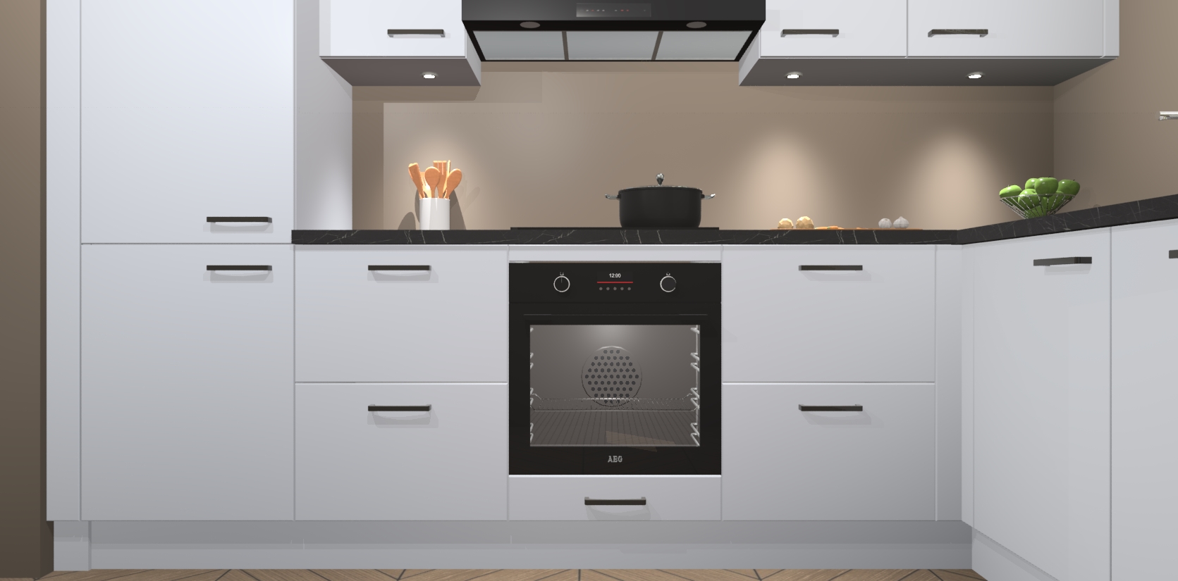 De Sneeuwwitte keuken Geneve is uitgerust met 5 inbouwapparaten - een oven, inductiekookplaat, afzuigkap, vaatwasser en koelkast - voor al uw kook- en bewaarbehoeftes. U kunt deze apparaten desgewenst eenvoudig upgraden naar AEG of de oven omruilen voor een combimagnetron na het plaatsen van uw bestelling. En met de soft close deuren, voldoende opbergruimte en kasten die voorgemonteerd worden geleverd, bent u in een mum van tijd klaar om heerlijke maaltijden te bereiden!