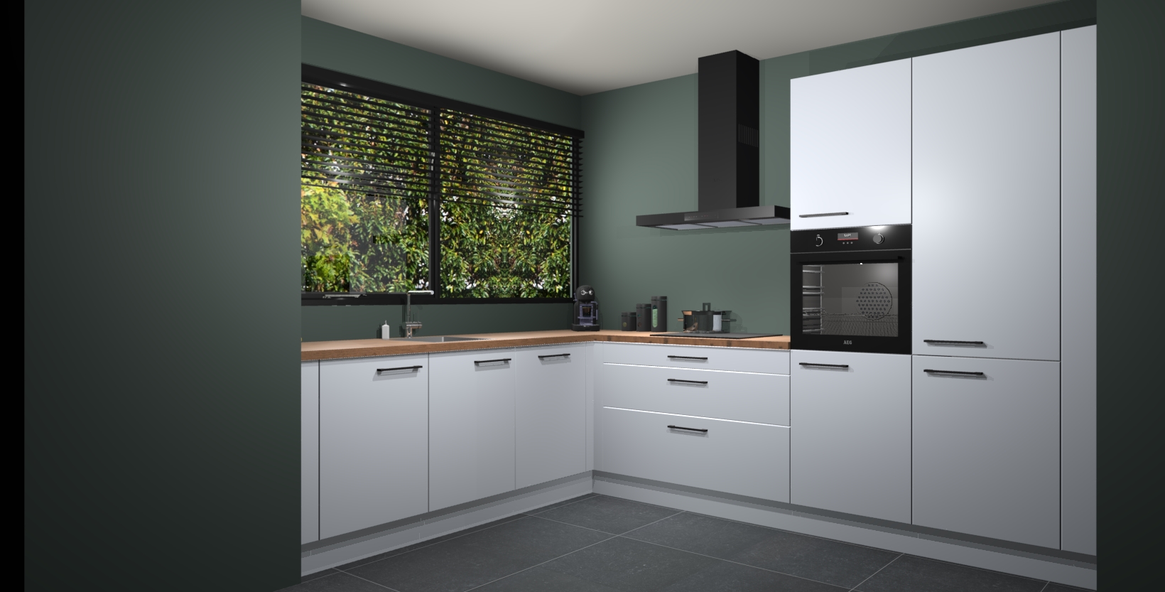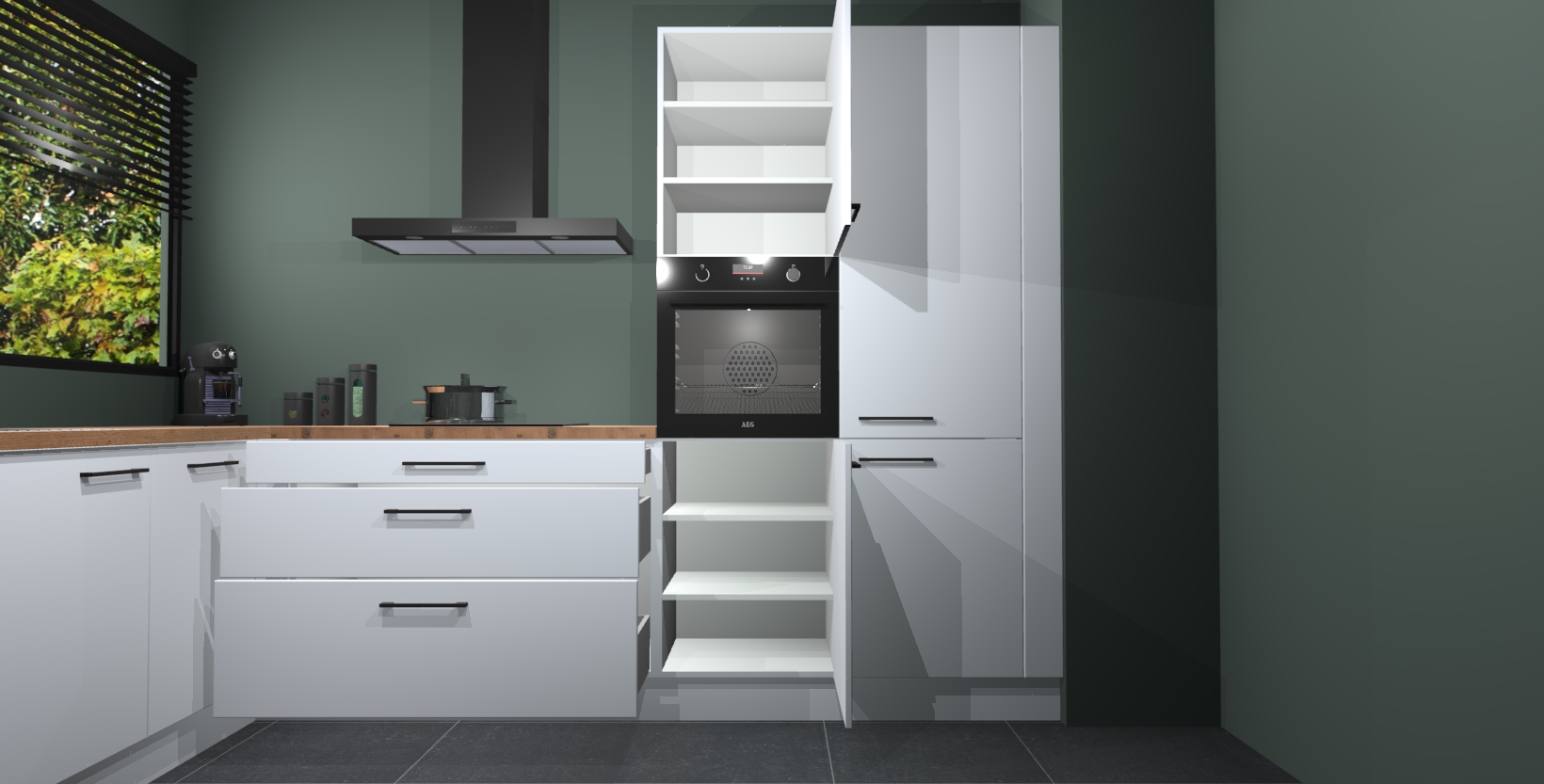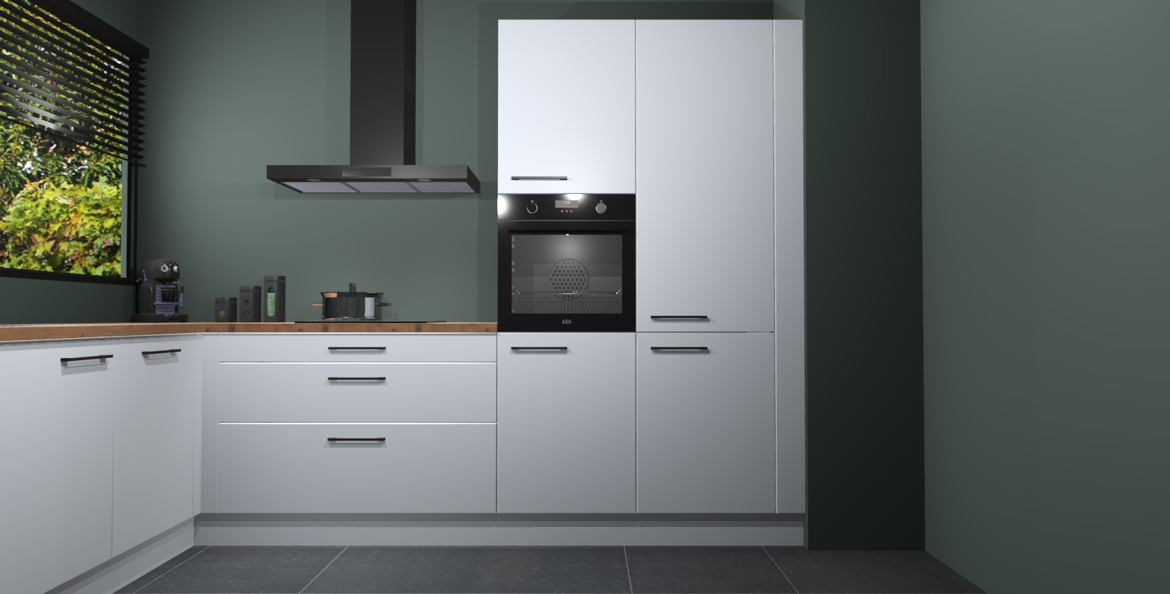 Met een modern, tijdloos design en ruime opslagruimte, zult u zich in no-time thuis voelen in uw nieuwe keuken. Uw leven wordt eenvoudiger met de soft-close deuren die voor het ultieme stille comfort zorgen - geen geluid dat u stoort terwijl u kookt. Ook is de keuken voorzien van 5 ingebouwde apparaten: een oven, inductie kookplaat, afzuigkap, vaatwasser en koelkast. Deze kunnen gemakkelijk na bestelling worden bijgewerkt naar AEG - waardoor uw luxe ervaring compleet is.