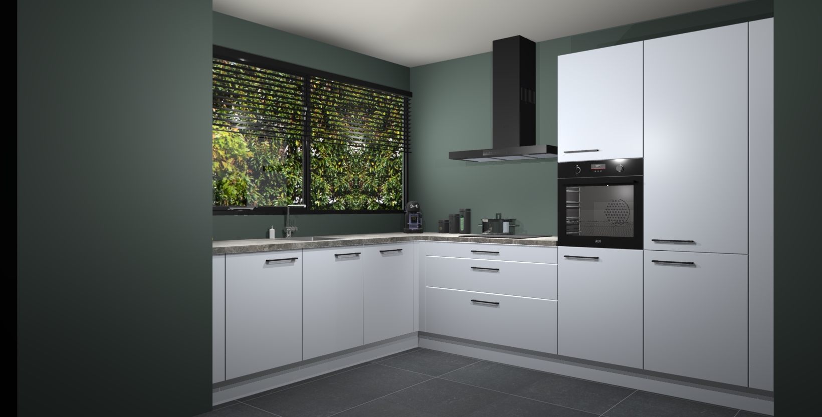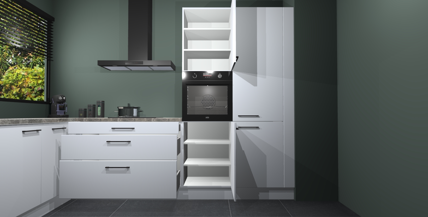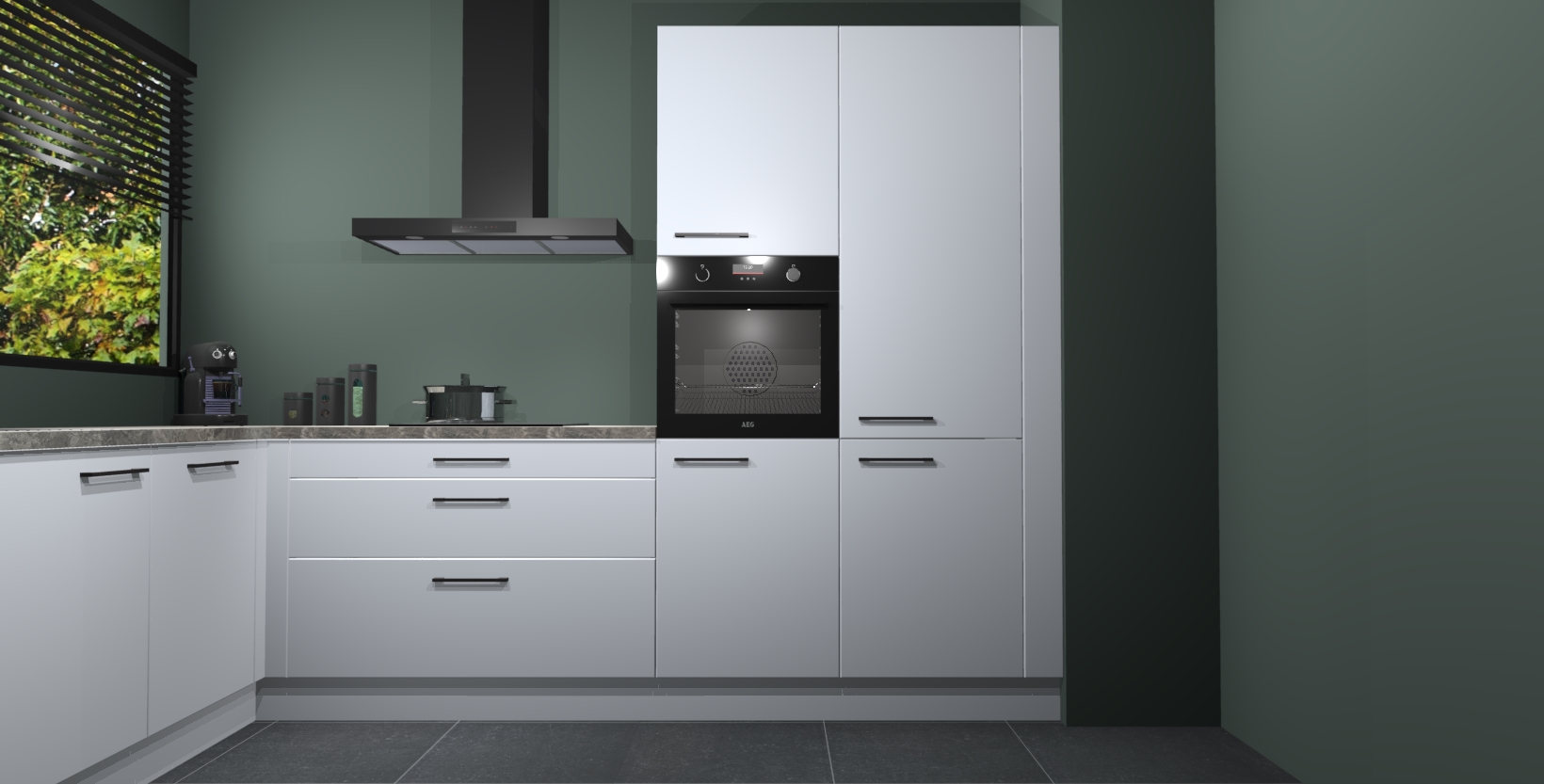 Met een modern, tijdloos design en ruime opslagruimte, zult u zich in no-time thuis voelen in uw nieuwe keuken. Uw leven wordt eenvoudiger met de soft-close deuren die voor het ultieme stille comfort zorgen - geen geluid dat u stoort terwijl u kookt. Ook is de keuken voorzien van 5 ingebouwde apparaten: een oven, inductie kookplaat, afzuigkap, vaatwasser en koelkast. Deze kunnen gemakkelijk na bestelling worden bijgewerkt naar AEG - waardoor uw luxe ervaring compleet is.