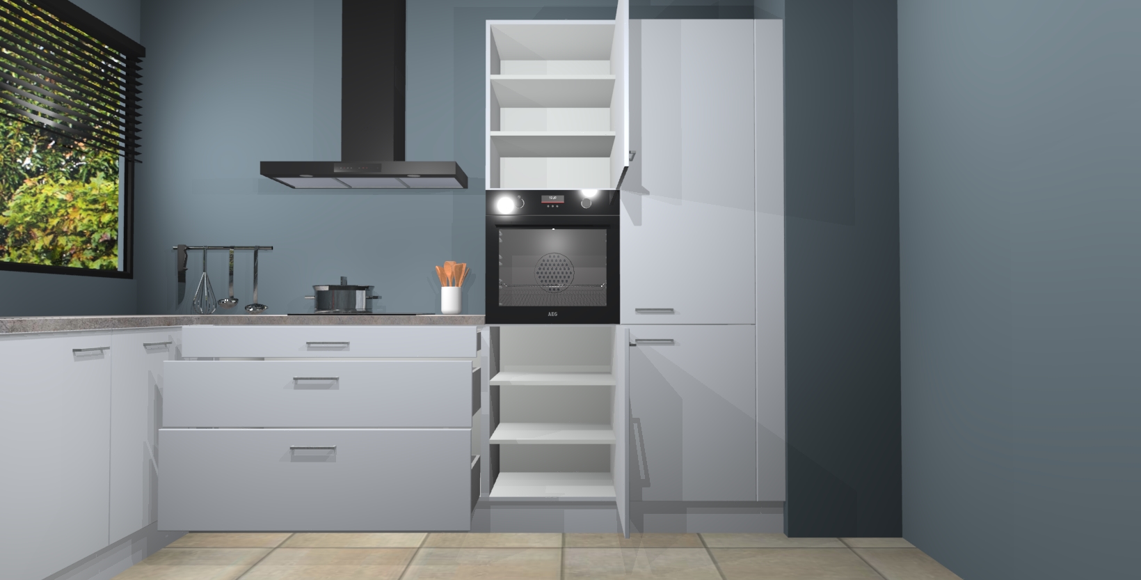 Met een modern, tijdloos design en ruime opslagruimte, zult u zich in no-time thuis voelen in uw nieuwe keuken. Uw leven wordt eenvoudiger met de soft-close deuren die voor het ultieme stille comfort zorgen - geen geluid dat u stoort terwijl u kookt. Ook is de keuken voorzien van 5 ingebouwde apparaten: een oven, inductie kookplaat, afzuigkap, vaatwasser en koelkast. Deze kunnen gemakkelijk na bestelling worden bijgewerkt naar AEG - waardoor uw luxe ervaring compleet is.