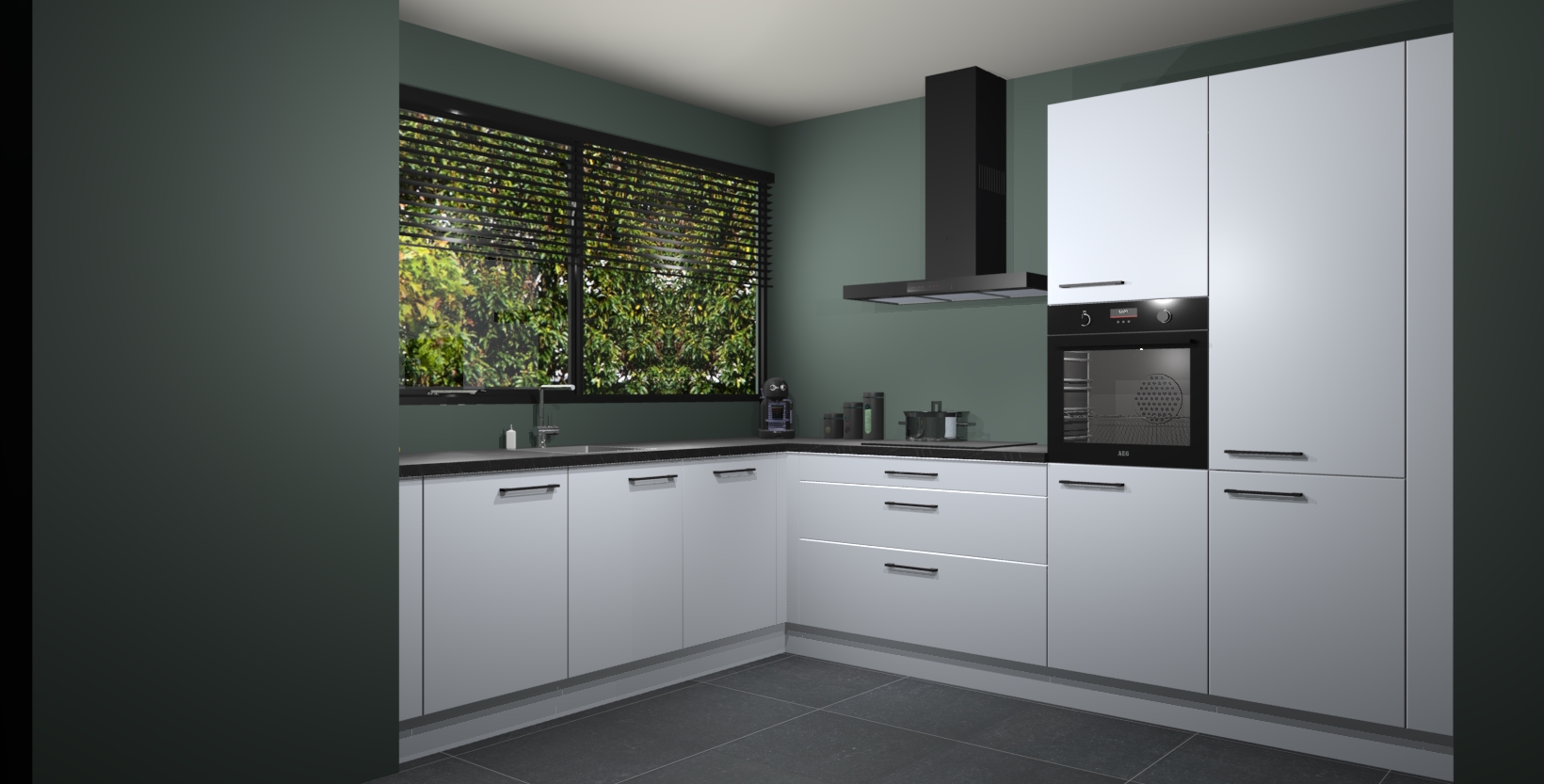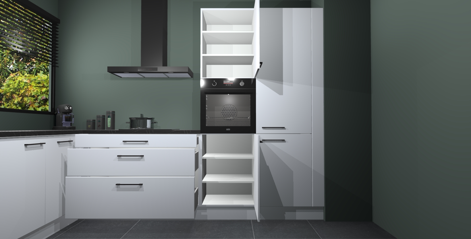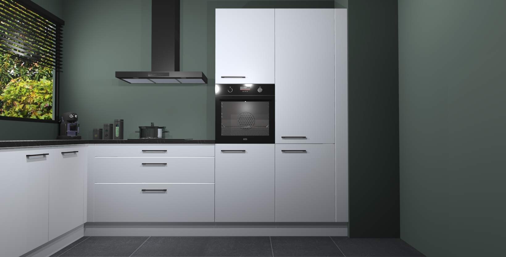 Met een modern, tijdloos design en ruime opslagruimte, zult u zich in no-time thuis voelen in uw nieuwe keuken. Uw leven wordt eenvoudiger met de soft-close deuren die voor het ultieme stille comfort zorgen - geen geluid dat u stoort terwijl u kookt. Ook is de keuken voorzien van 5 ingebouwde apparaten: een oven, inductie kookplaat, afzuigkap, vaatwasser en koelkast. Deze kunnen gemakkelijk na bestelling worden bijgewerkt naar AEG - waardoor uw luxe ervaring compleet is.