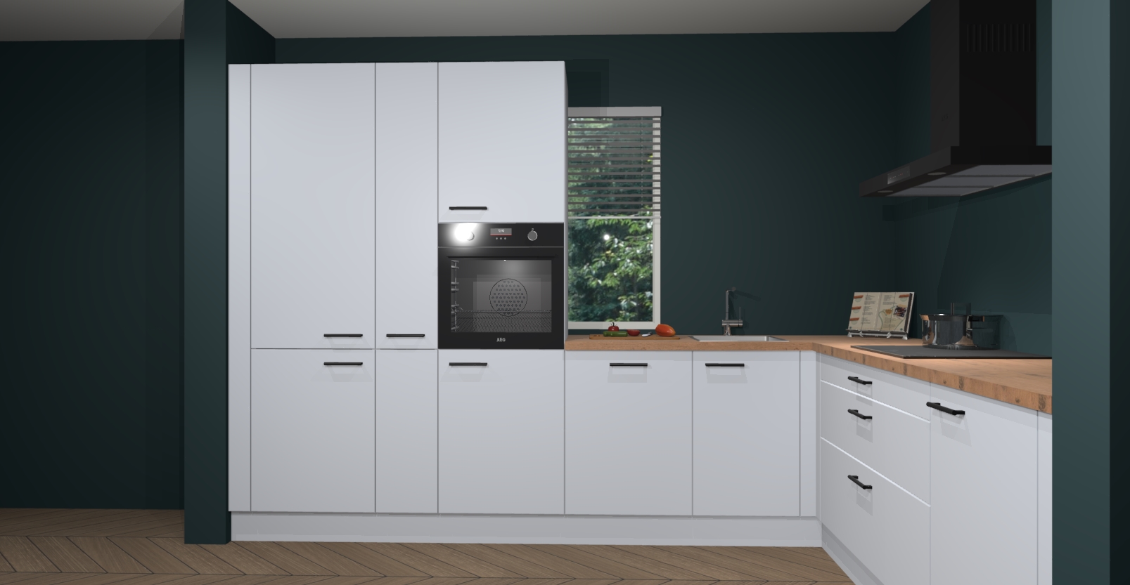 Met een modern, tijdloos design en ruime opslagruimte, zult u zich in no-time thuis voelen in uw nieuwe keuken. Uw leven wordt eenvoudiger met de soft-close deuren die voor het ultieme stille comfort zorgen - geen geluid dat u stoort terwijl u kookt. Ook is de keuken voorzien van 5 ingebouwde apparaten: een oven, inductie kookplaat, afzuigkap, vaatwasser en koelkast. Deze kunnen gemakkelijk na bestelling worden bijgewerkt naar AEG - waardoor uw luxe ervaring compleet is.