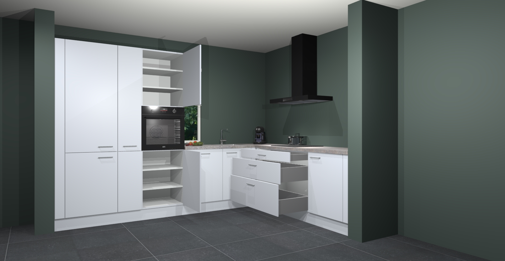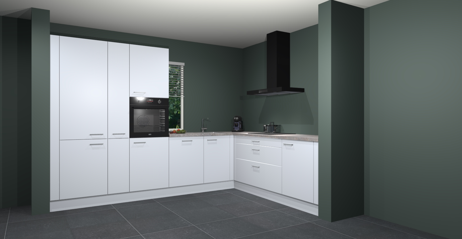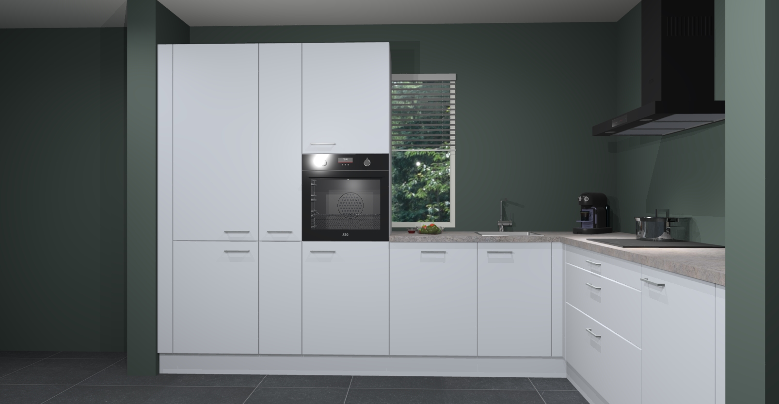 Met een modern, tijdloos design en ruime opslagruimte, zult u zich in no-time thuis voelen in uw nieuwe keuken. Uw leven wordt eenvoudiger met de soft-close deuren die voor het ultieme stille comfort zorgen - geen geluid dat u stoort terwijl u kookt. Ook is de keuken voorzien van 5 ingebouwde apparaten: een oven, inductie kookplaat, afzuigkap, vaatwasser en koelkast. Deze kunnen gemakkelijk na bestelling worden bijgewerkt naar AEG - waardoor uw luxe ervaring compleet is.