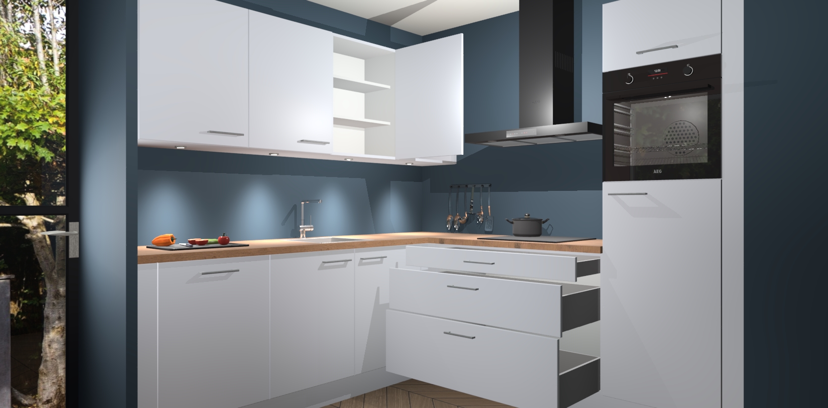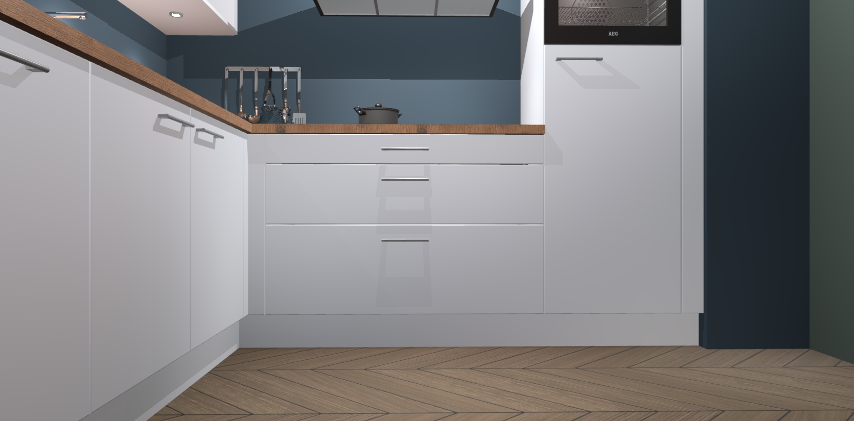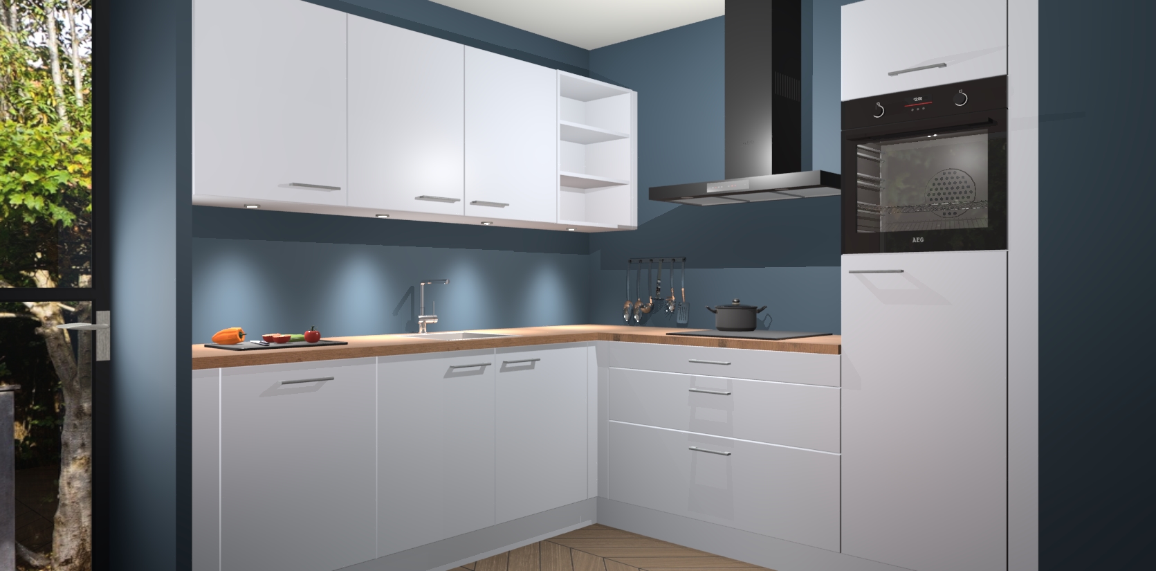 Met een modern, tijdloos design en ruime opslagruimte, zult u zich in no-time thuis voelen in uw nieuwe keuken. Uw leven wordt eenvoudiger met de soft-close deuren die voor het ultieme stille comfort zorgen - geen geluid dat u stoort terwijl u kookt. Ook is de keuken voorzien van 5 ingebouwde apparaten: een oven, inductie kookplaat, afzuigkap, vaatwasser en koelkast. Deze kunnen gemakkelijk na bestelling worden bijgewerkt naar AEG - waardoor uw luxe ervaring compleet is.