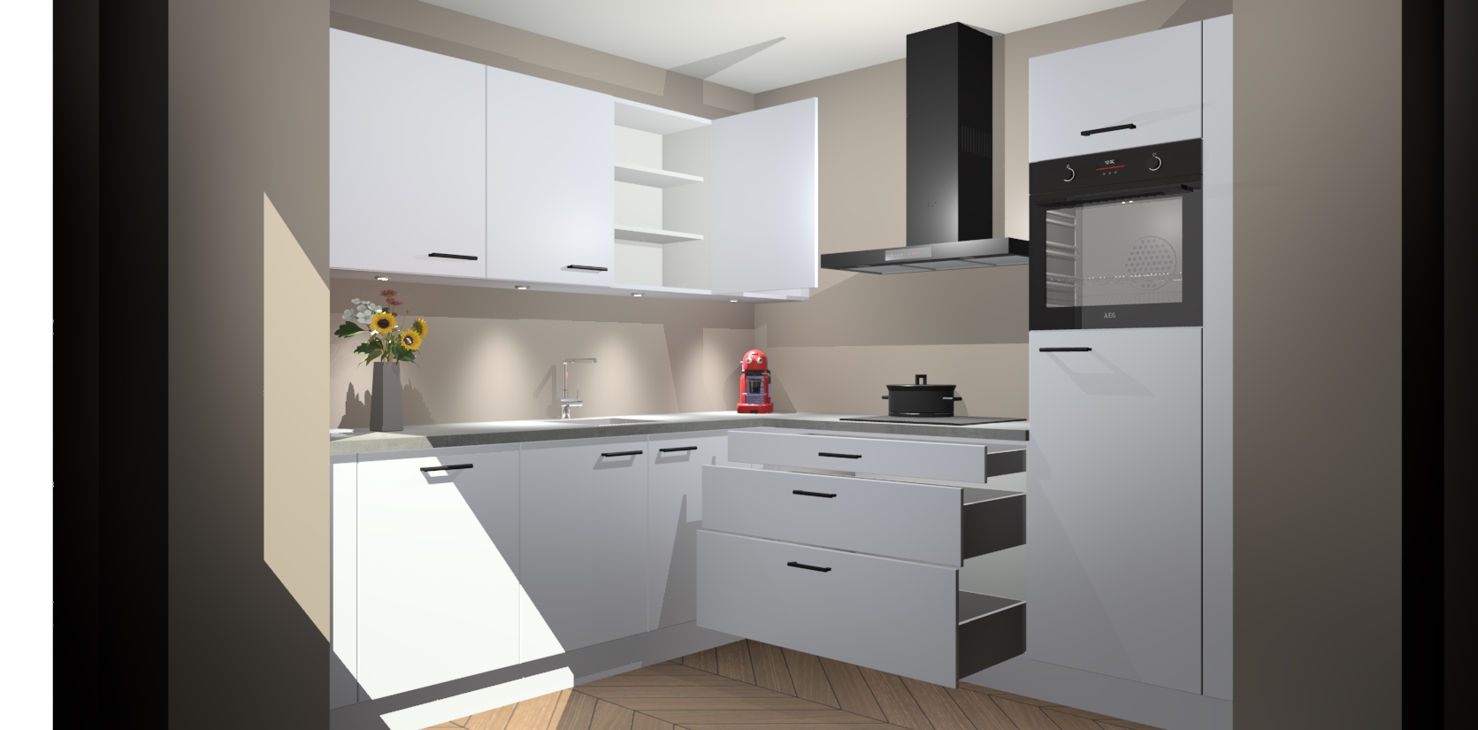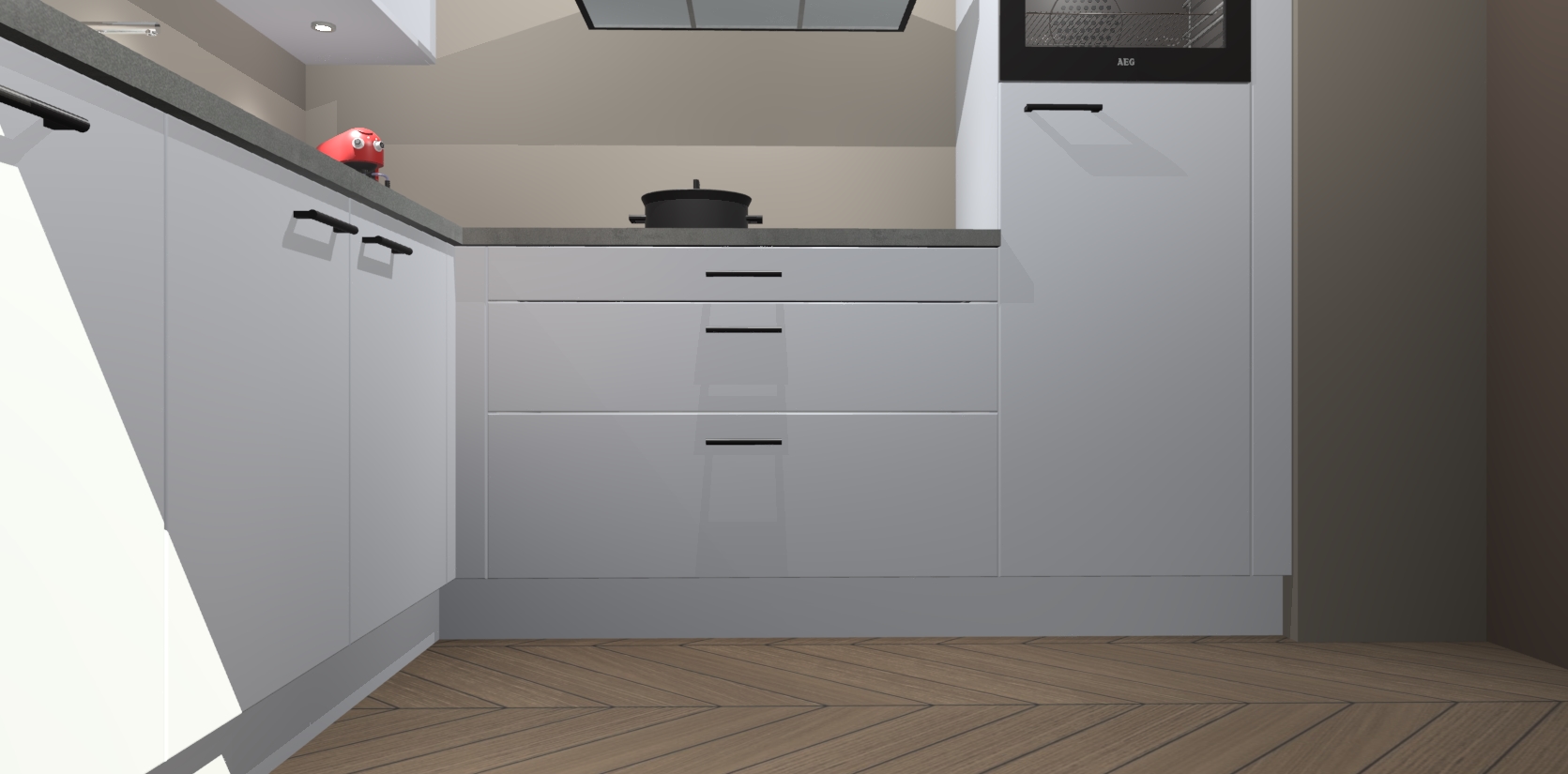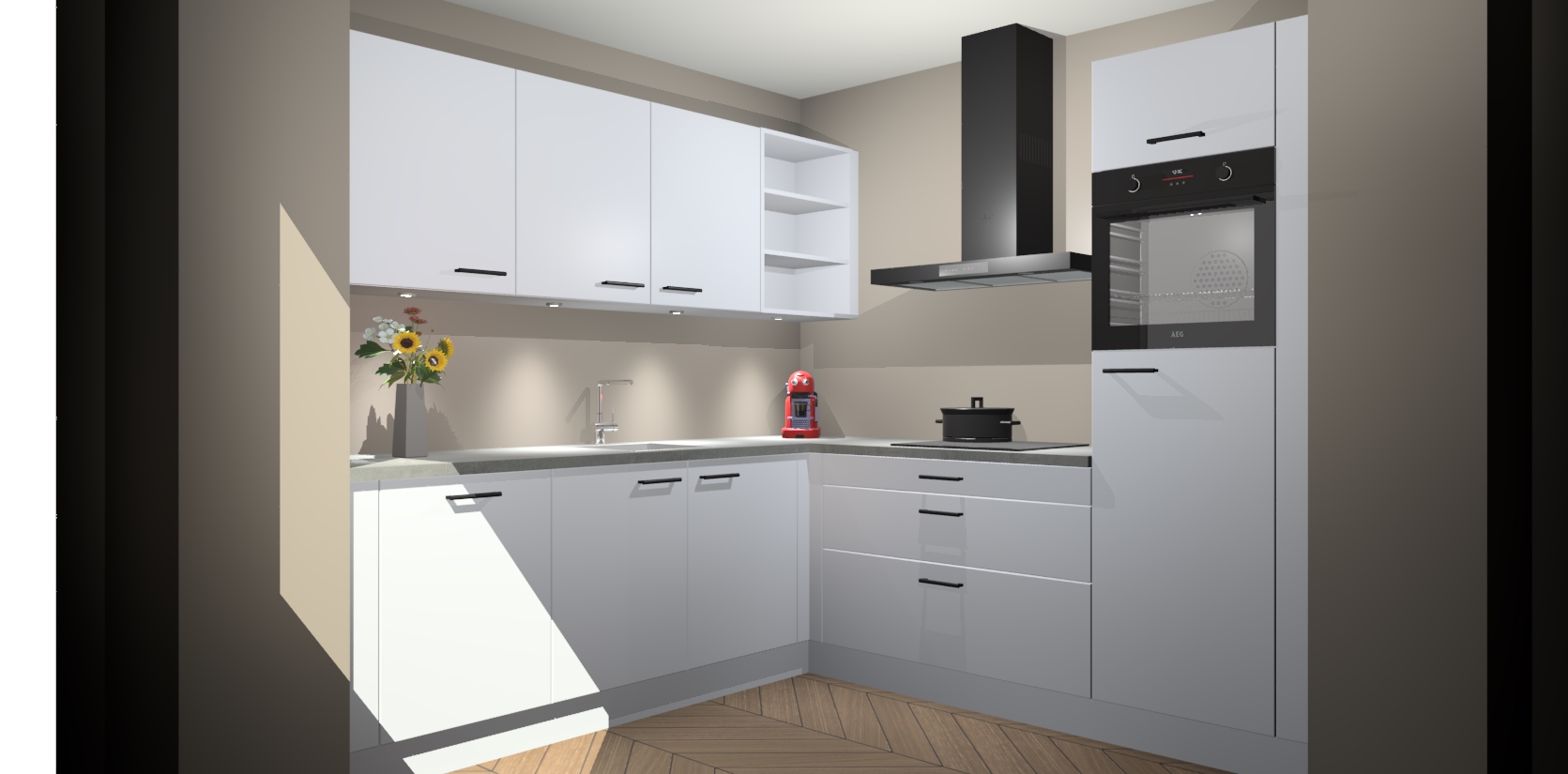 Met een modern, tijdloos design en ruime opslagruimte, zult u zich in no-time thuis voelen in uw nieuwe keuken. Uw leven wordt eenvoudiger met de soft-close deuren die voor het ultieme stille comfort zorgen - geen geluid dat u stoort terwijl u kookt. Ook is de keuken voorzien van 5 ingebouwde apparaten: een oven, inductie kookplaat, afzuigkap, vaatwasser en koelkast. Deze kunnen gemakkelijk na bestelling worden bijgewerkt naar AEG - waardoor uw luxe ervaring compleet is.