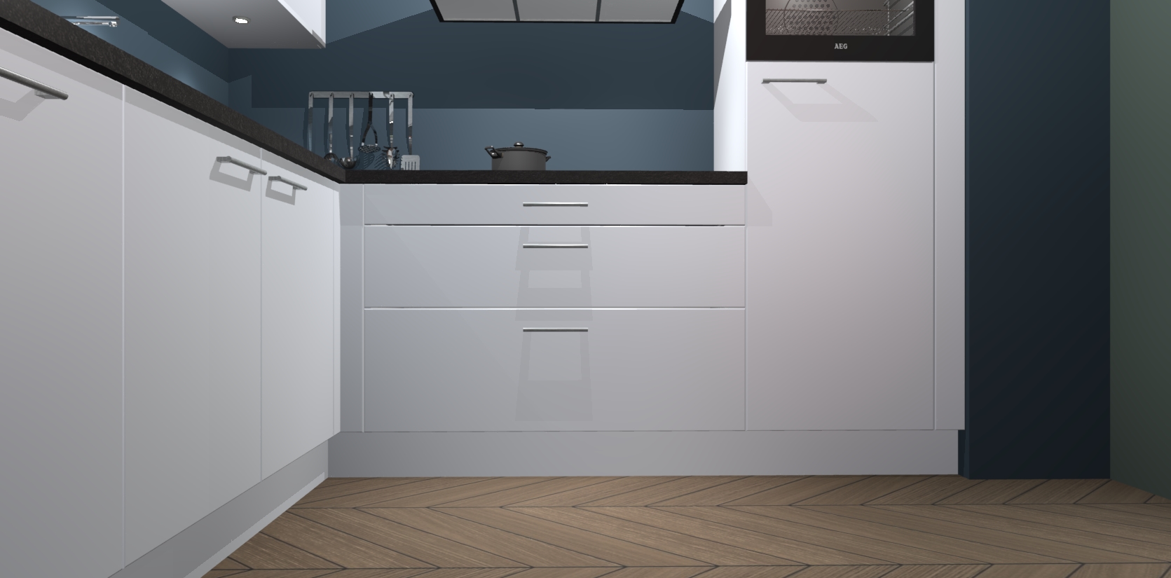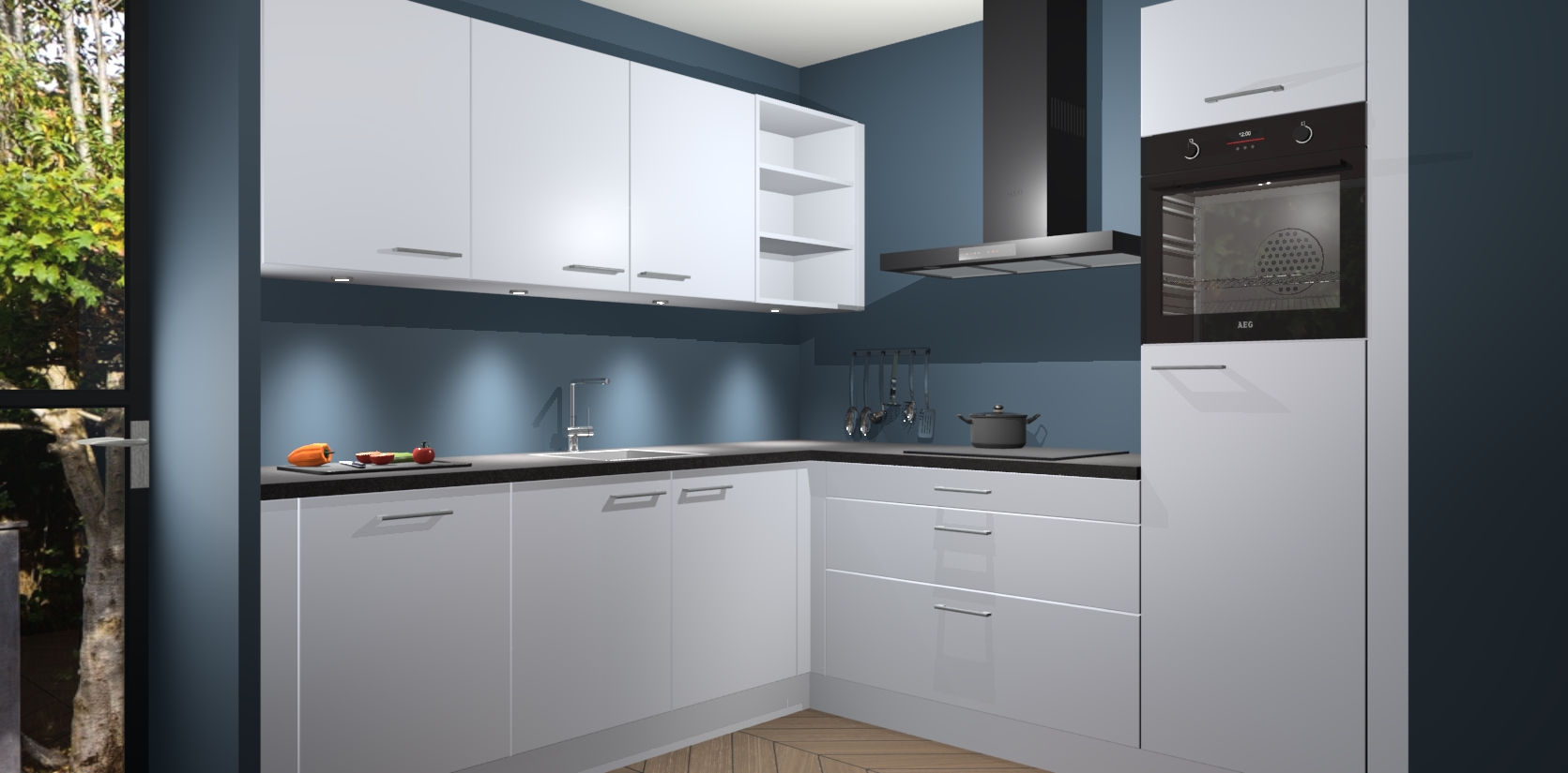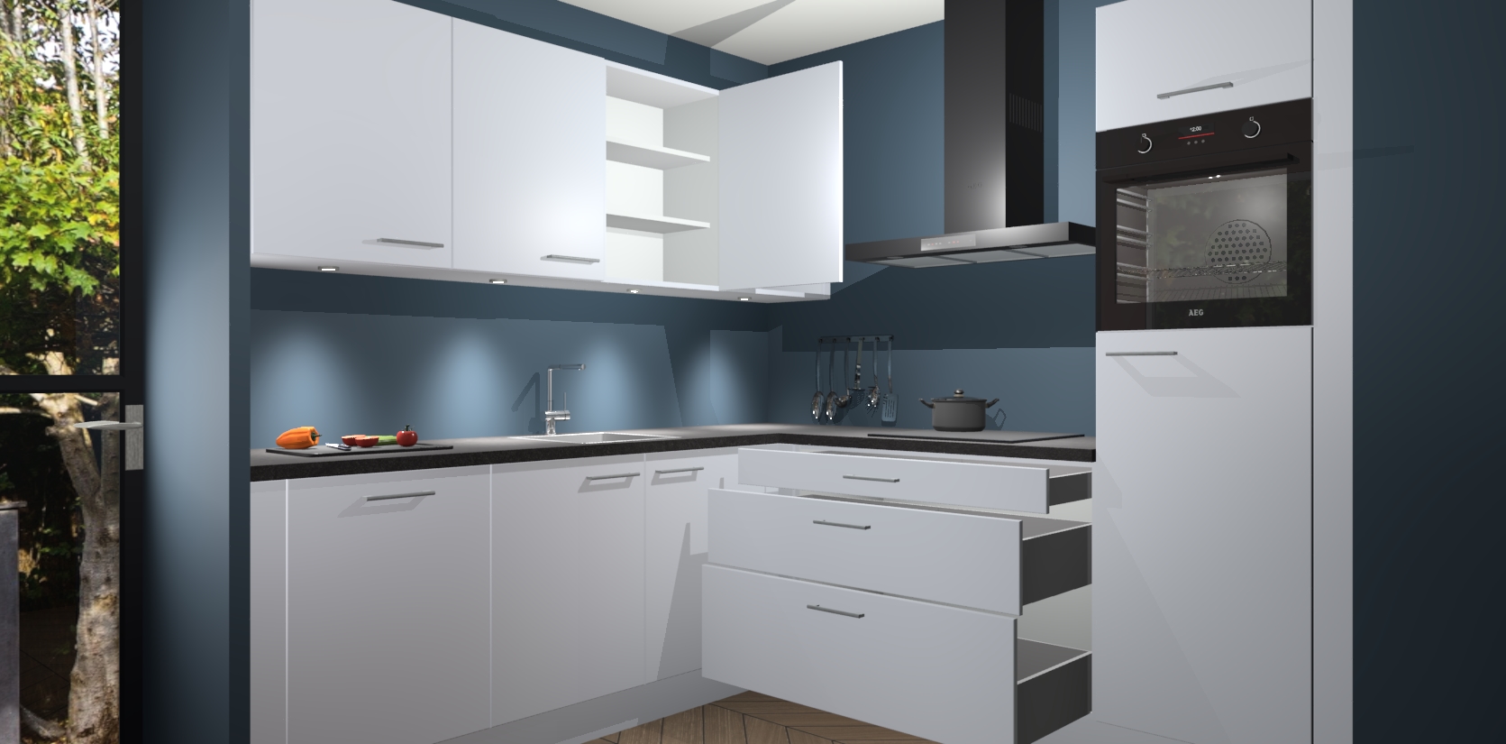 Met een modern, tijdloos design en ruime opslagruimte, zult u zich in no-time thuis voelen in uw nieuwe keuken. Uw leven wordt eenvoudiger met de soft-close deuren die voor het ultieme stille comfort zorgen - geen geluid dat u stoort terwijl u kookt. Ook is de keuken voorzien van 5 ingebouwde apparaten: een oven, inductie kookplaat, afzuigkap, vaatwasser en koelkast. Deze kunnen gemakkelijk na bestelling worden bijgewerkt naar AEG - waardoor uw luxe ervaring compleet is.