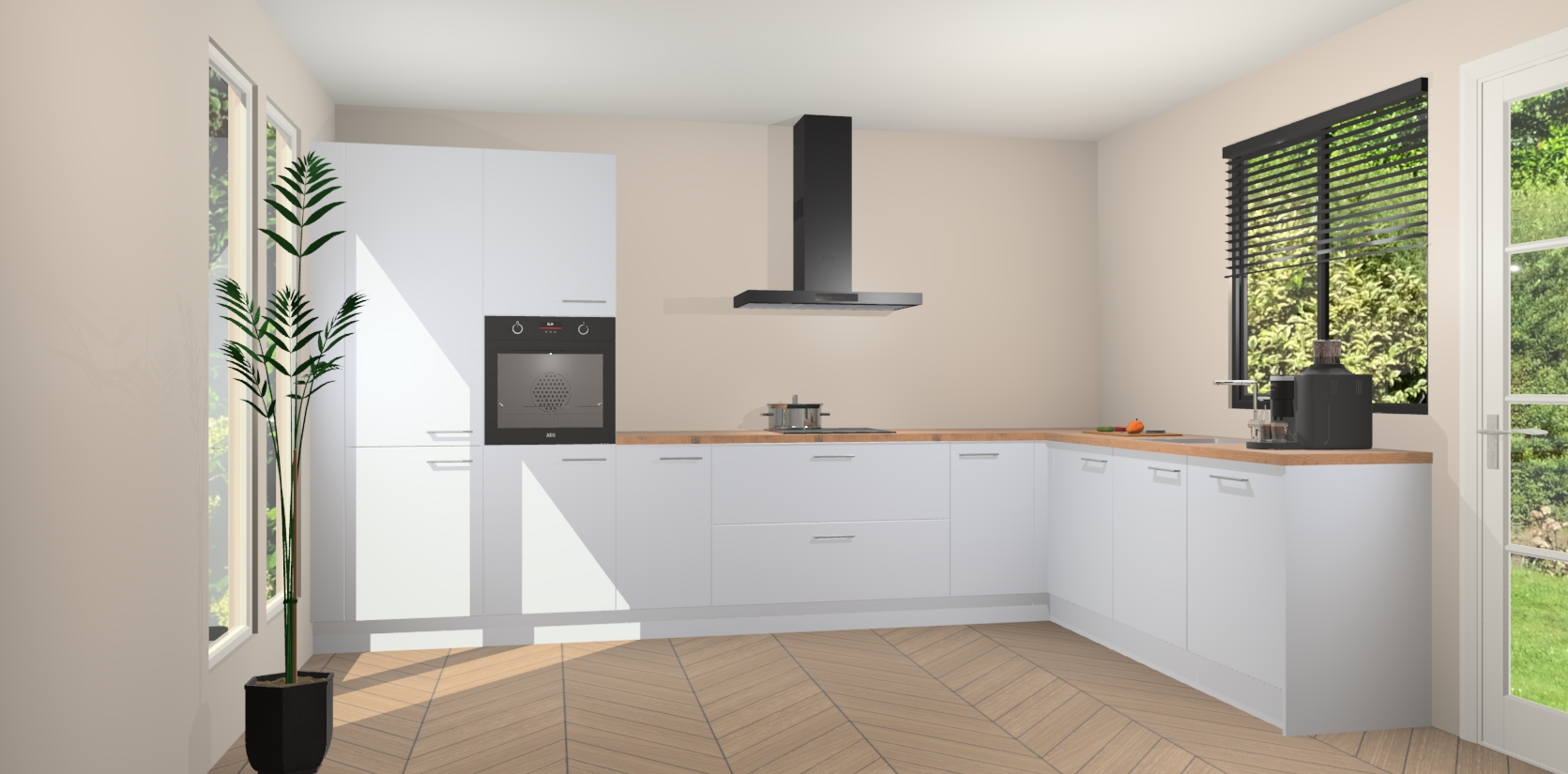 Met een modern, tijdloos design en ruime opslagruimte, zult u zich in no-time thuis voelen in uw nieuwe keuken. Uw leven wordt eenvoudiger met de soft-close deuren die voor het ultieme stille comfort zorgen - geen geluid dat u stoort terwijl u kookt. Ook is de keuken voorzien van 5 ingebouwde apparaten: een oven, inductie kookplaat, afzuigkap, vaatwasser en koelkast. Deze kunnen gemakkelijk na bestelling worden bijgewerkt naar AEG - waardoor uw luxe ervaring compleet is.