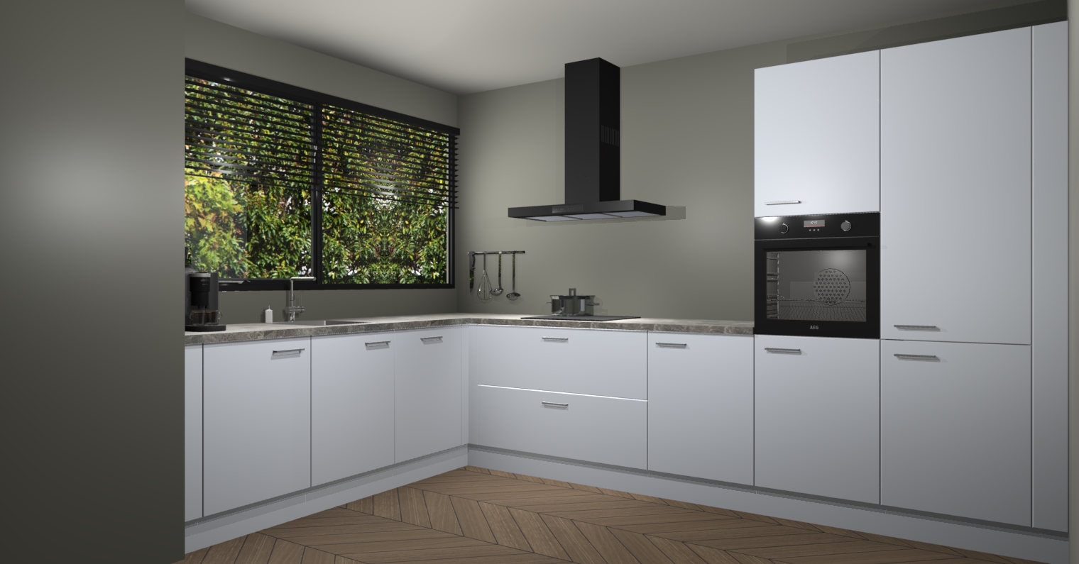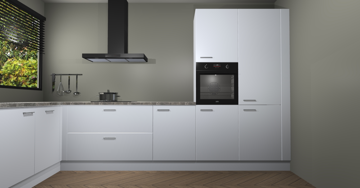 Met een modern, tijdloos design en ruime opslagruimte, zult u zich in no-time thuis voelen in uw nieuwe keuken. Uw leven wordt eenvoudiger met de soft-close deuren die voor het ultieme stille comfort zorgen - geen geluid dat u stoort terwijl u kookt. Ook is de keuken voorzien van 5 ingebouwde apparaten: een oven, inductie kookplaat, afzuigkap, vaatwasser en koelkast. Deze kunnen gemakkelijk na bestelling worden bijgewerkt naar AEG - waardoor uw luxe ervaring compleet is.