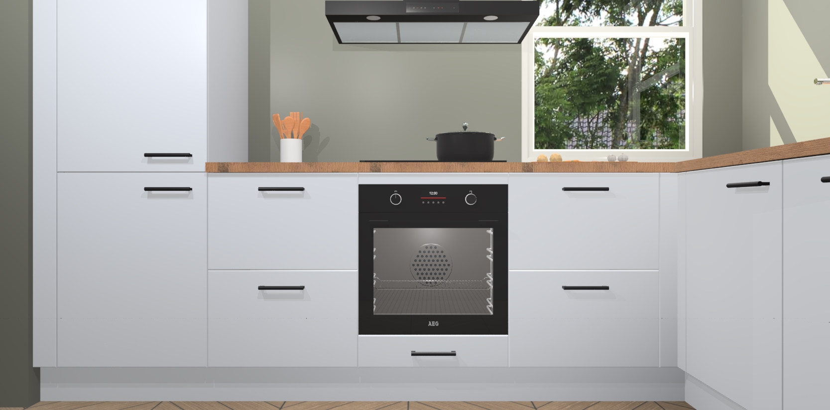 Wat maakt deze keuken zo bijzonder? Ten eerste geeft het houten werkblad uw ruimte een onmiskenbaar klassieke uitstraling. De natuurlijke afwerking roept warmte en elegantie op die nooit uit de mode zullen raken. Bovendien is het gemakkelijk schoon te houden en te onderhouden, zodat je er jarenlang plezier van kunt hebben. Als u op zoek bent naar extra gemak in uw keuken, dan heeft u bij het plaatsen van een bestelling bij ons ook de optie om uw toestellen te upgraden naar AEG-modellen - zo haalt u moderne innovatie van topmerken in apparatentechnologie rechtstreeks in huis.
