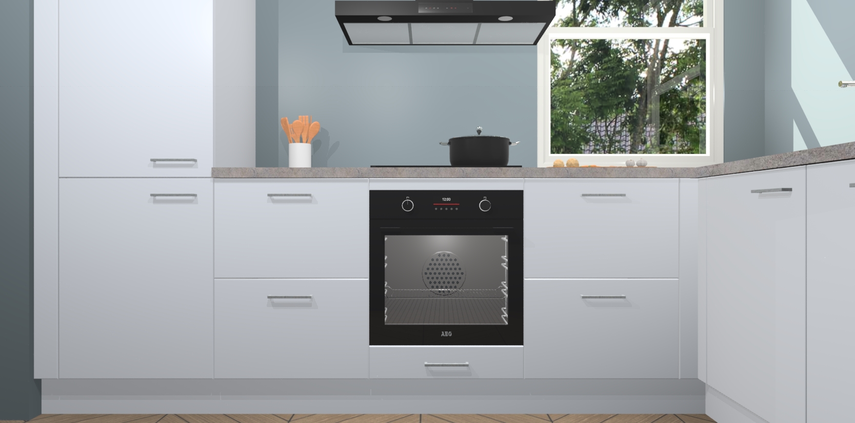 Wat maakt deze keuken zo bijzonder? Ten eerste geeft het houten werkblad uw ruimte een onmiskenbaar klassieke uitstraling. De natuurlijke afwerking roept warmte en elegantie op die nooit uit de mode zullen raken. Bovendien is het gemakkelijk schoon te houden en te onderhouden, zodat je er jarenlang plezier van kunt hebben. Als u op zoek bent naar extra gemak in uw keuken, dan heeft u bij het plaatsen van een bestelling bij ons ook de optie om uw toestellen te upgraden naar AEG-modellen - zo haalt u moderne innovatie van topmerken in apparatentechnologie rechtstreeks in huis.