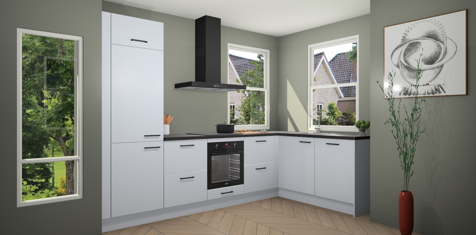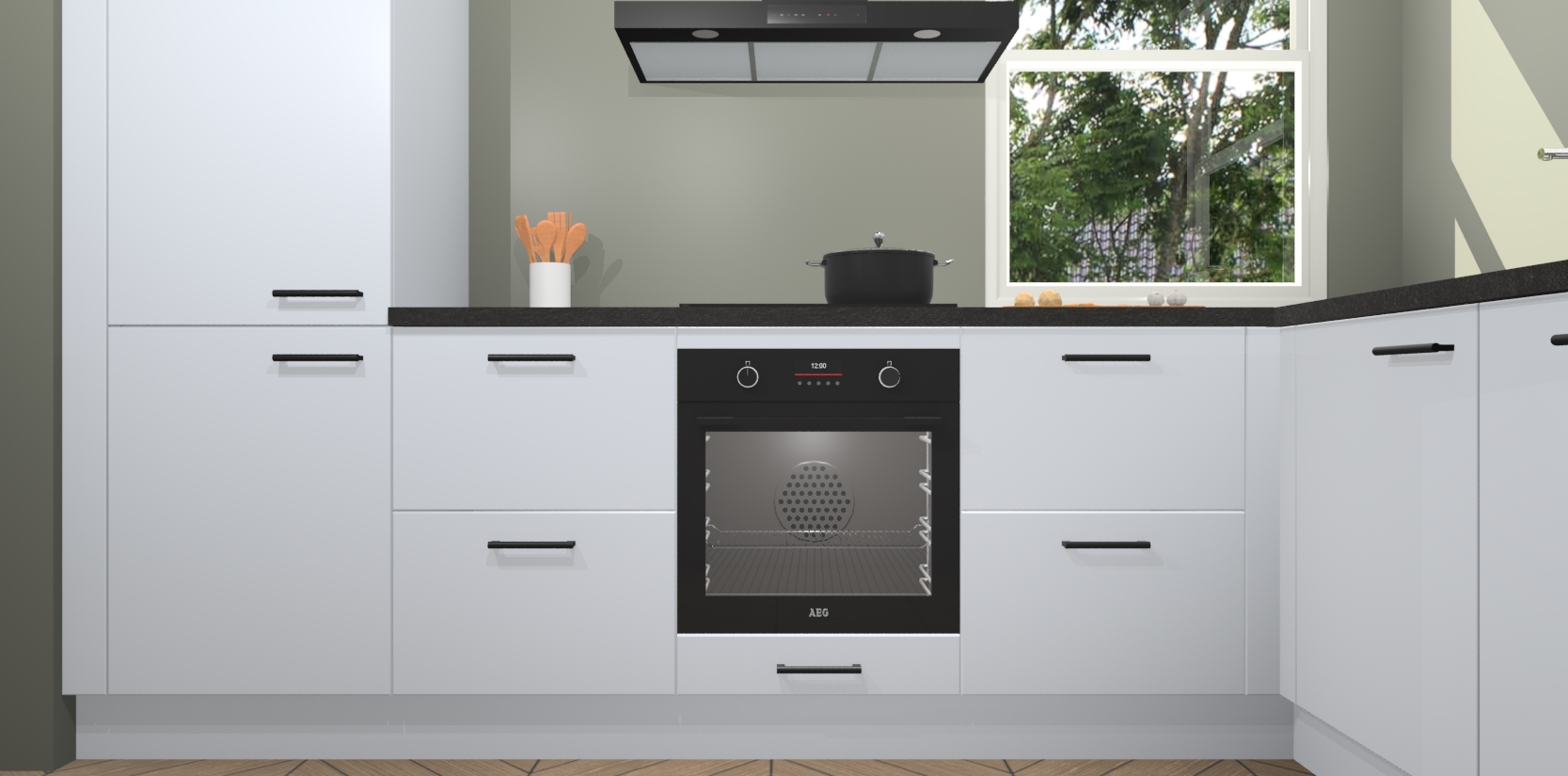Wat maakt deze keuken zo bijzonder? Ten eerste geeft het houten werkblad uw ruimte een onmiskenbaar klassieke uitstraling. De natuurlijke afwerking roept warmte en elegantie op die nooit uit de mode zullen raken. Bovendien is het gemakkelijk schoon te houden en te onderhouden, zodat je er jarenlang plezier van kunt hebben. Als u op zoek bent naar extra gemak in uw keuken, dan heeft u bij het plaatsen van een bestelling bij ons ook de optie om uw toestellen te upgraden naar AEG-modellen - zo haalt u moderne innovatie van topmerken in apparatentechnologie rechtstreeks in huis.