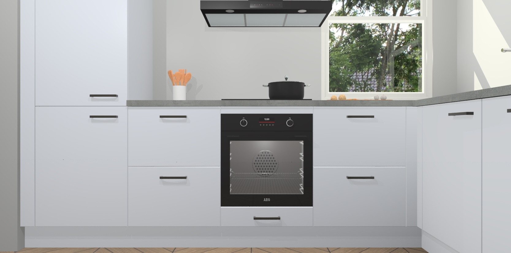 Wat maakt deze keuken zo bijzonder? Ten eerste geeft het houten werkblad uw ruimte een onmiskenbaar klassieke uitstraling. De natuurlijke afwerking roept warmte en elegantie op die nooit uit de mode zullen raken. Bovendien is het gemakkelijk schoon te houden en te onderhouden, zodat je er jarenlang plezier van kunt hebben. Als u op zoek bent naar extra gemak in uw keuken, dan heeft u bij het plaatsen van een bestelling bij ons ook de optie om uw toestellen te upgraden naar AEG-modellen - zo haalt u moderne innovatie van topmerken in apparatentechnologie rechtstreeks in huis.