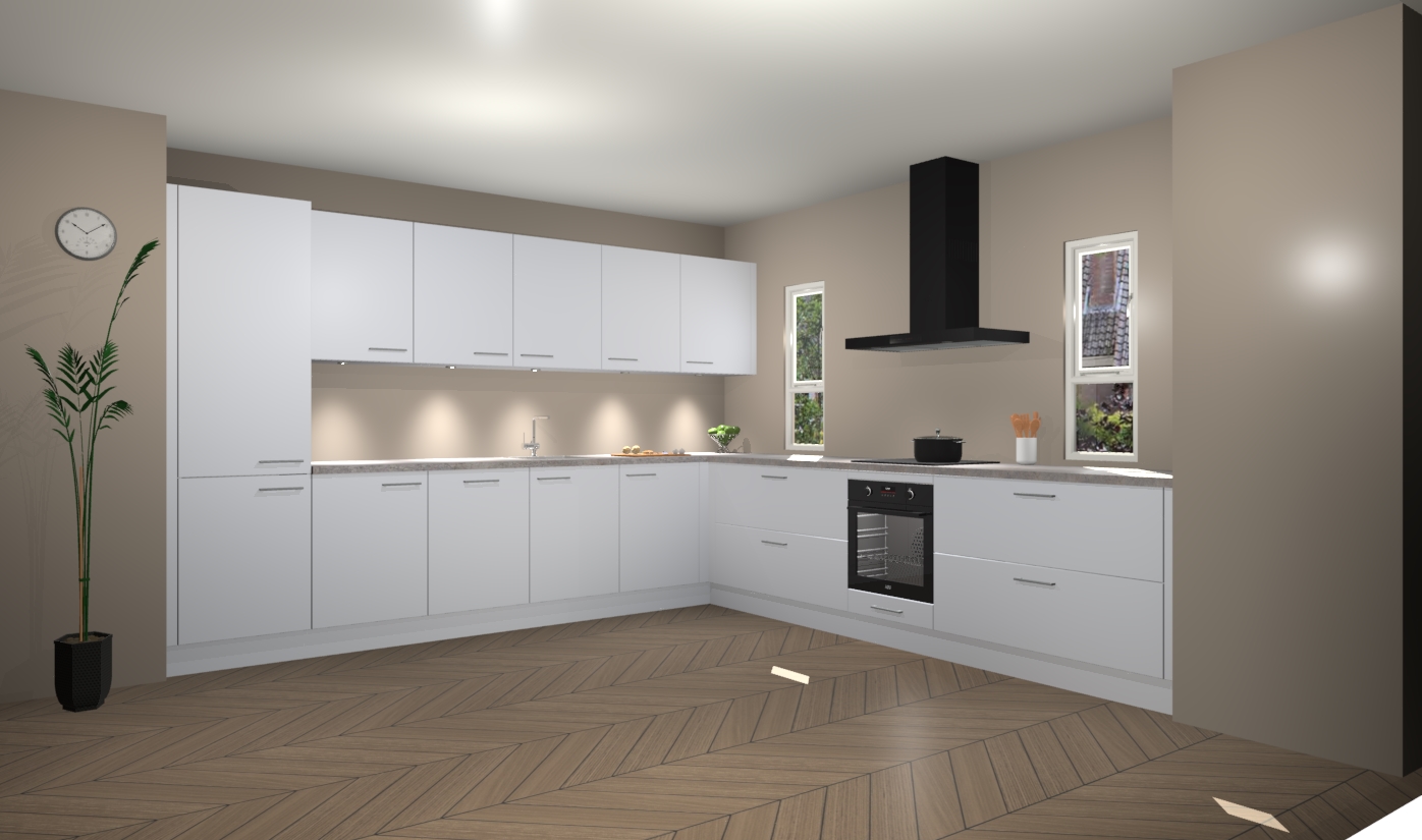 De sneeuwwite keuken is een ideale hoekkeuken en heeft alle functies en apparatuur die u maar nodig kunt hebben. Bij de bestelling krijgt u een oven, inductiekookplaat, afzuigkap, vaatwasser en koelkast - deze kunnen desgewenst eenvoudig worden uitgebreid naar AEG na bestellen. Elke kast wordt ook voor gemonteerd geleverd met soft close deuren die jarenlang gebruik beloven. Stelt u zich voor dat u geen gedoe heeft met vervelende montage - vanaf het moment dat u uw bestelling plaats, duurt het slechts 7 weken voor het bij u thuis geleverd wordt.