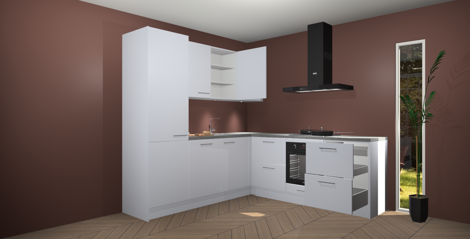 Met zijn moderne design en aantrekkelijke hoekopstelling biedt deze keuken een unieke look die zelfs de meest veeleisende huiseigenaar zal bevallen. En omdat de binnenkant van de kasten dezelfde kleur heeft als de buitenkant, heeft uw keuken een consistente afwerking. Bovenop de geweldige look is opbergruimte ook geen probleem, met voldoende kast- en laderuimte achter zelfs de mooiste buitenkant.