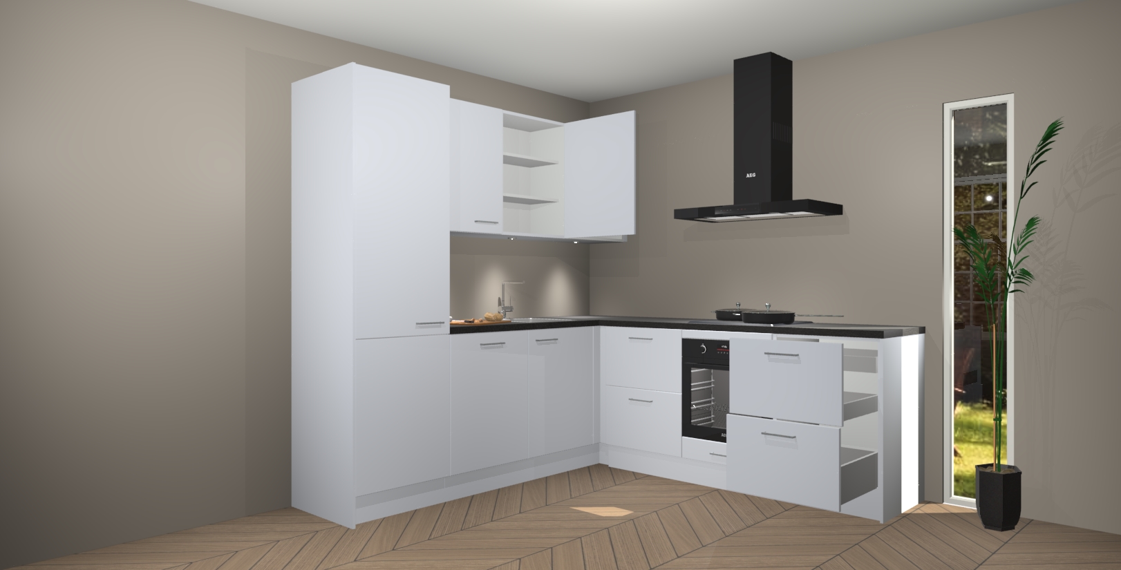 Met zijn moderne design en aantrekkelijke hoekopstelling biedt deze keuken een unieke look die zelfs de meest veeleisende huiseigenaar zal bevallen. En omdat de binnenkant van de kasten dezelfde kleur heeft als de buitenkant, heeft uw keuken een consistente afwerking. Bovenop de geweldige look is opbergruimte ook geen probleem, met voldoende kast- en laderuimte achter zelfs de mooiste buitenkant.