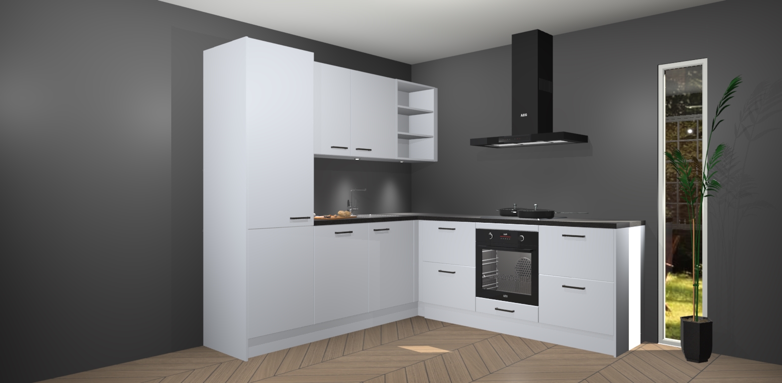 Met zijn moderne design en aantrekkelijke hoekopstelling biedt deze keuken een unieke look die zelfs de meest veeleisende huiseigenaar zal bevallen. En omdat de binnenkant van de kasten dezelfde kleur heeft als de buitenkant, heeft uw keuken een consistente afwerking. Bovenop de geweldige look is opbergruimte ook geen probleem, met voldoende kast- en laderuimte achter zelfs de mooiste buitenkant.