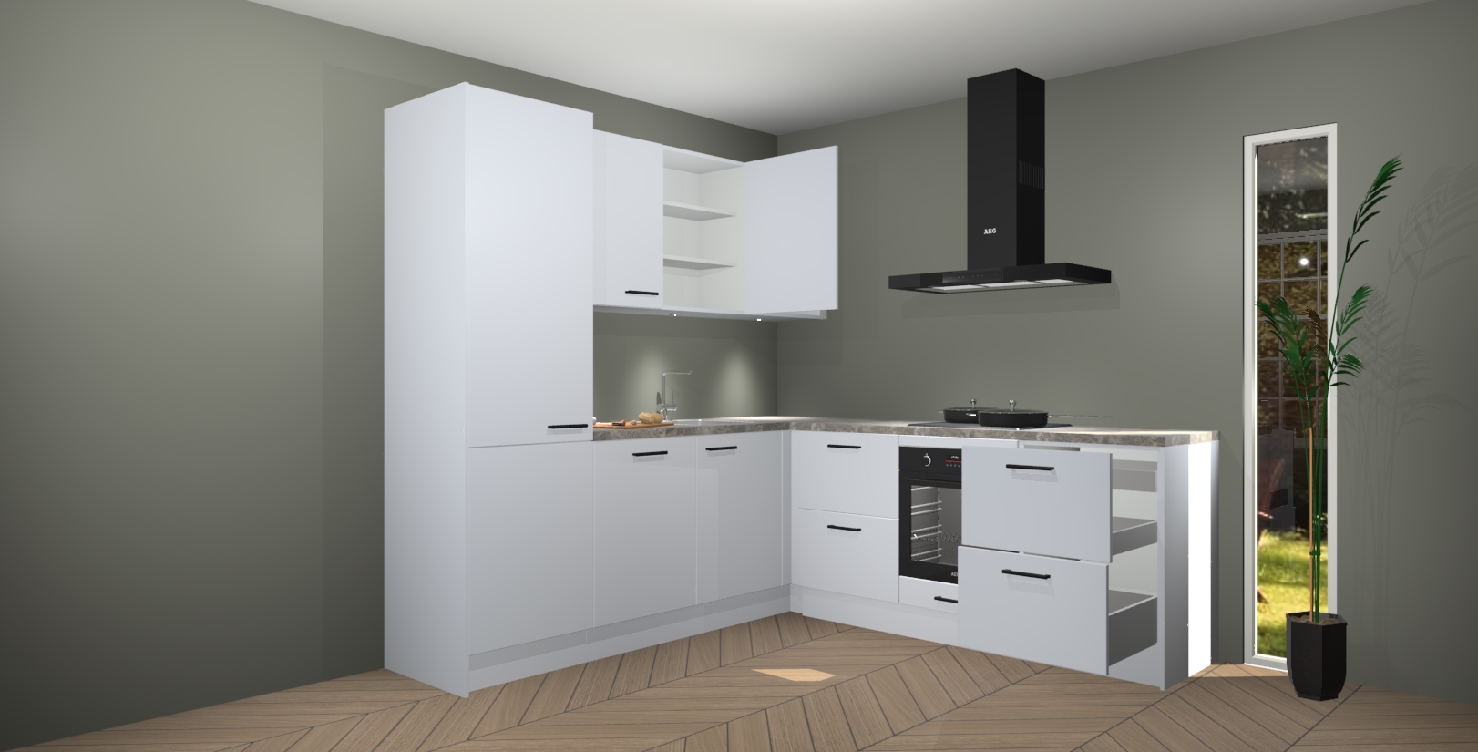 Met zijn moderne design en aantrekkelijke hoekopstelling biedt deze keuken een unieke look die zelfs de meest veeleisende huiseigenaar zal bevallen. En omdat de binnenkant van de kasten dezelfde kleur heeft als de buitenkant, heeft uw keuken een consistente afwerking. Bovenop de geweldige look is opbergruimte ook geen probleem, met voldoende kast- en laderuimte achter zelfs de mooiste buitenkant.
