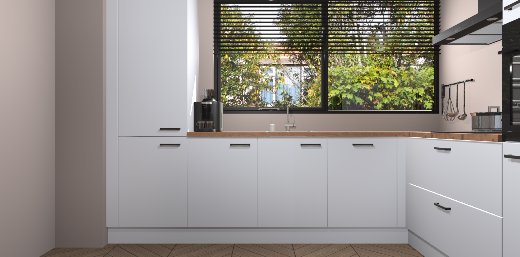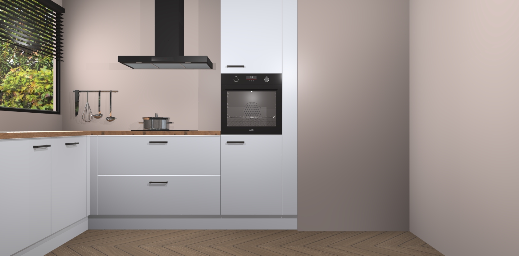 Met een modern, tijdloos design en ruime opslagruimte, zult u zich in no-time thuis voelen in uw nieuwe keuken. Uw leven wordt eenvoudiger met de soft-close deuren die voor het ultieme stille comfort zorgen - geen geluid dat u stoort terwijl u kookt. Ook is de keuken voorzien van 5 ingebouwde apparaten: een oven, inductie kookplaat, afzuigkap, vaatwasser en koelkast. Deze kunnen gemakkelijk na bestelling worden bijgewerkt naar AEG - waardoor uw luxe ervaring compleet is.