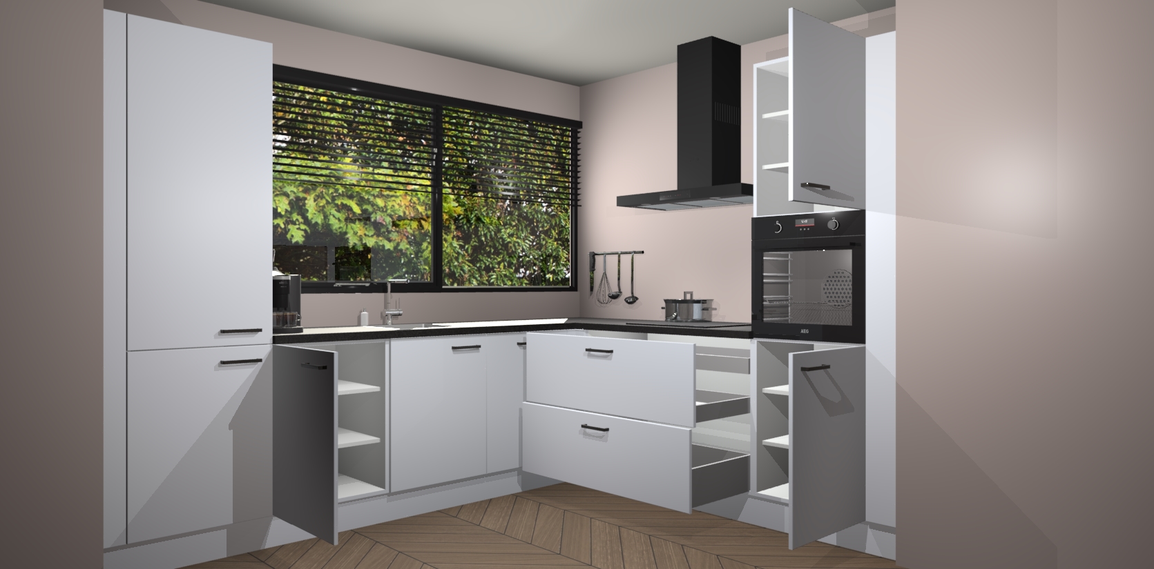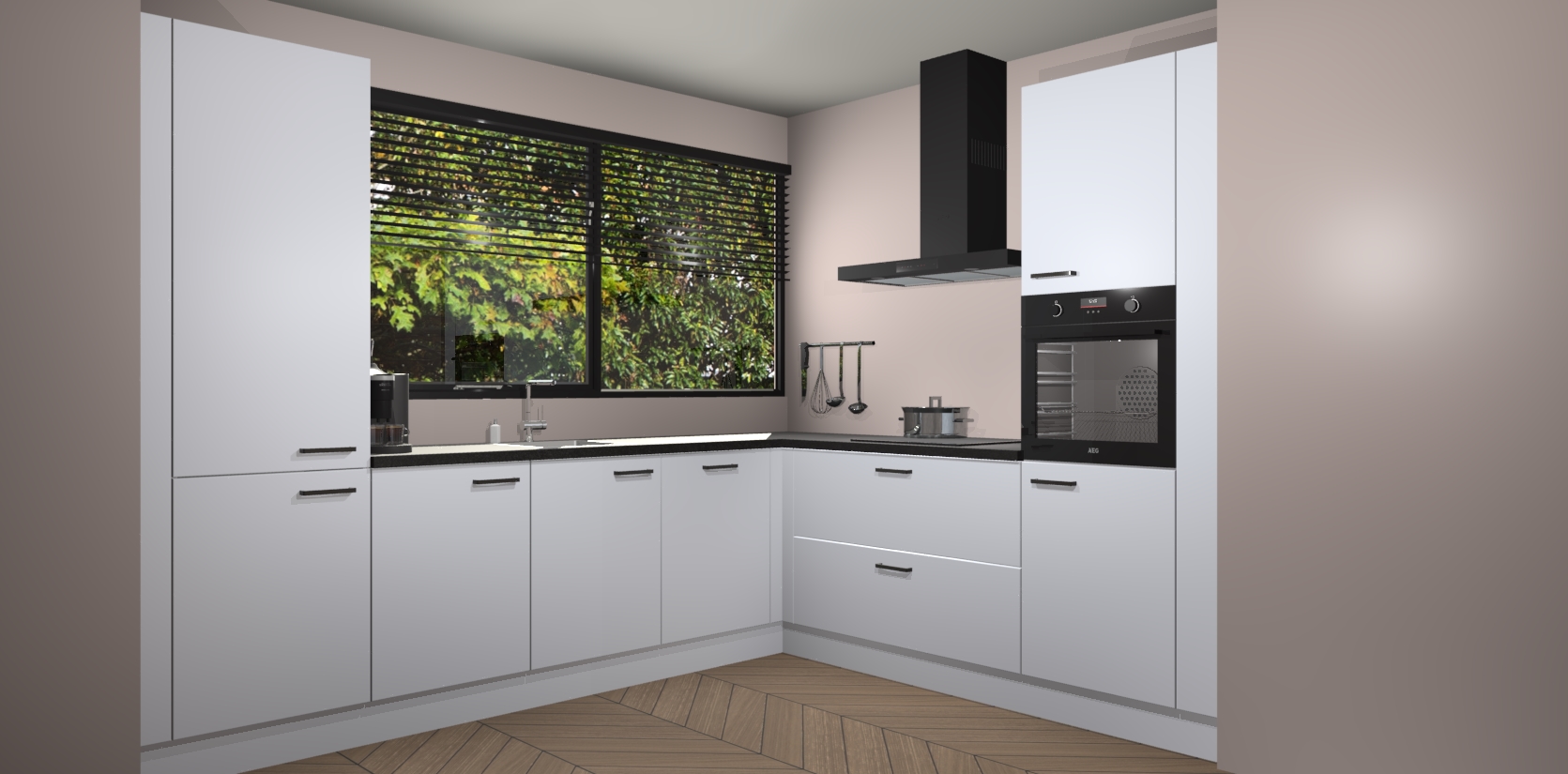 Met een modern, tijdloos design en ruime opslagruimte, zult u zich in no-time thuis voelen in uw nieuwe keuken. Uw leven wordt eenvoudiger met de soft-close deuren die voor het ultieme stille comfort zorgen - geen geluid dat u stoort terwijl u kookt. Ook is de keuken voorzien van 5 ingebouwde apparaten: een oven, inductie kookplaat, afzuigkap, vaatwasser en koelkast. Deze kunnen gemakkelijk na bestelling worden bijgewerkt naar AEG - waardoor uw luxe ervaring compleet is.