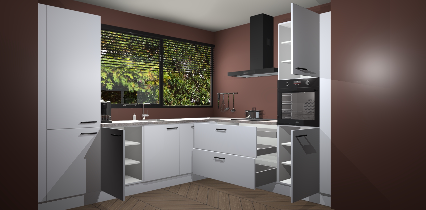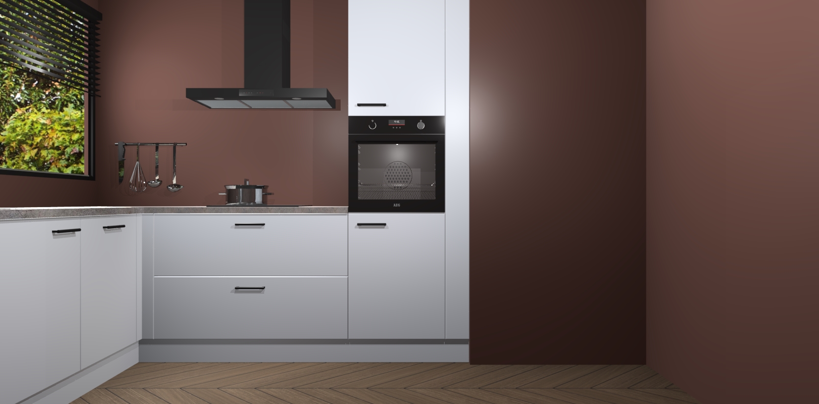 Met een modern, tijdloos design en ruime opslagruimte, zult u zich in no-time thuis voelen in uw nieuwe keuken. Uw leven wordt eenvoudiger met de soft-close deuren die voor het ultieme stille comfort zorgen - geen geluid dat u stoort terwijl u kookt. Ook is de keuken voorzien van 5 ingebouwde apparaten: een oven, inductie kookplaat, afzuigkap, vaatwasser en koelkast. Deze kunnen gemakkelijk na bestelling worden bijgewerkt naar AEG - waardoor uw luxe ervaring compleet is.