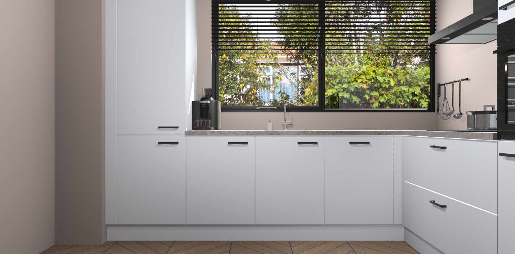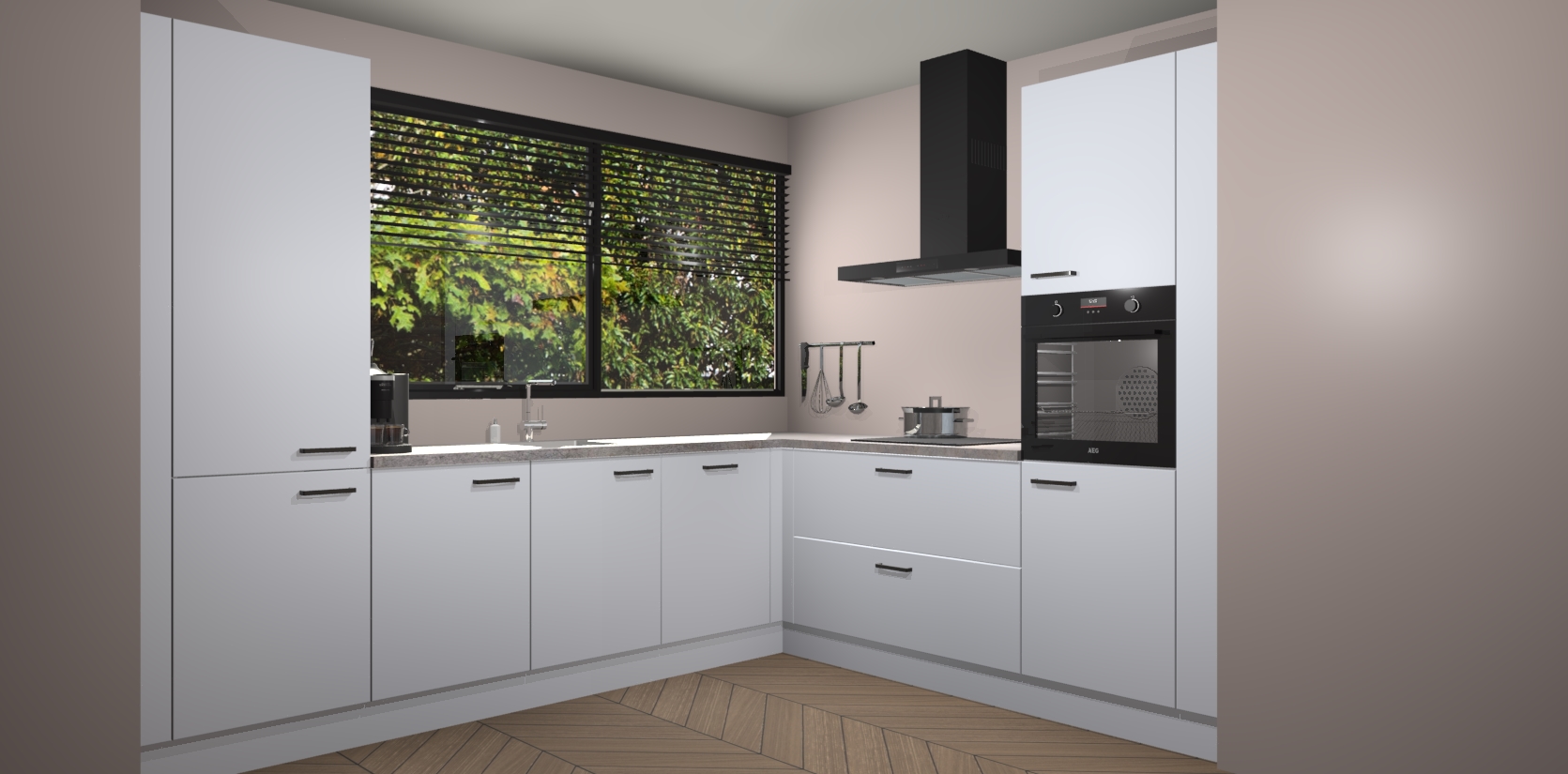 Met een modern, tijdloos design en ruime opslagruimte, zult u zich in no-time thuis voelen in uw nieuwe keuken. Uw leven wordt eenvoudiger met de soft-close deuren die voor het ultieme stille comfort zorgen - geen geluid dat u stoort terwijl u kookt. Ook is de keuken voorzien van 5 ingebouwde apparaten: een oven, inductie kookplaat, afzuigkap, vaatwasser en koelkast. Deze kunnen gemakkelijk na bestelling worden bijgewerkt naar AEG - waardoor uw luxe ervaring compleet is.