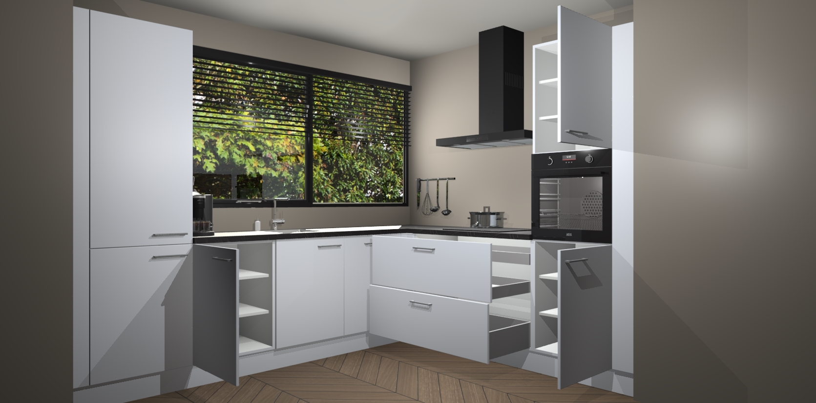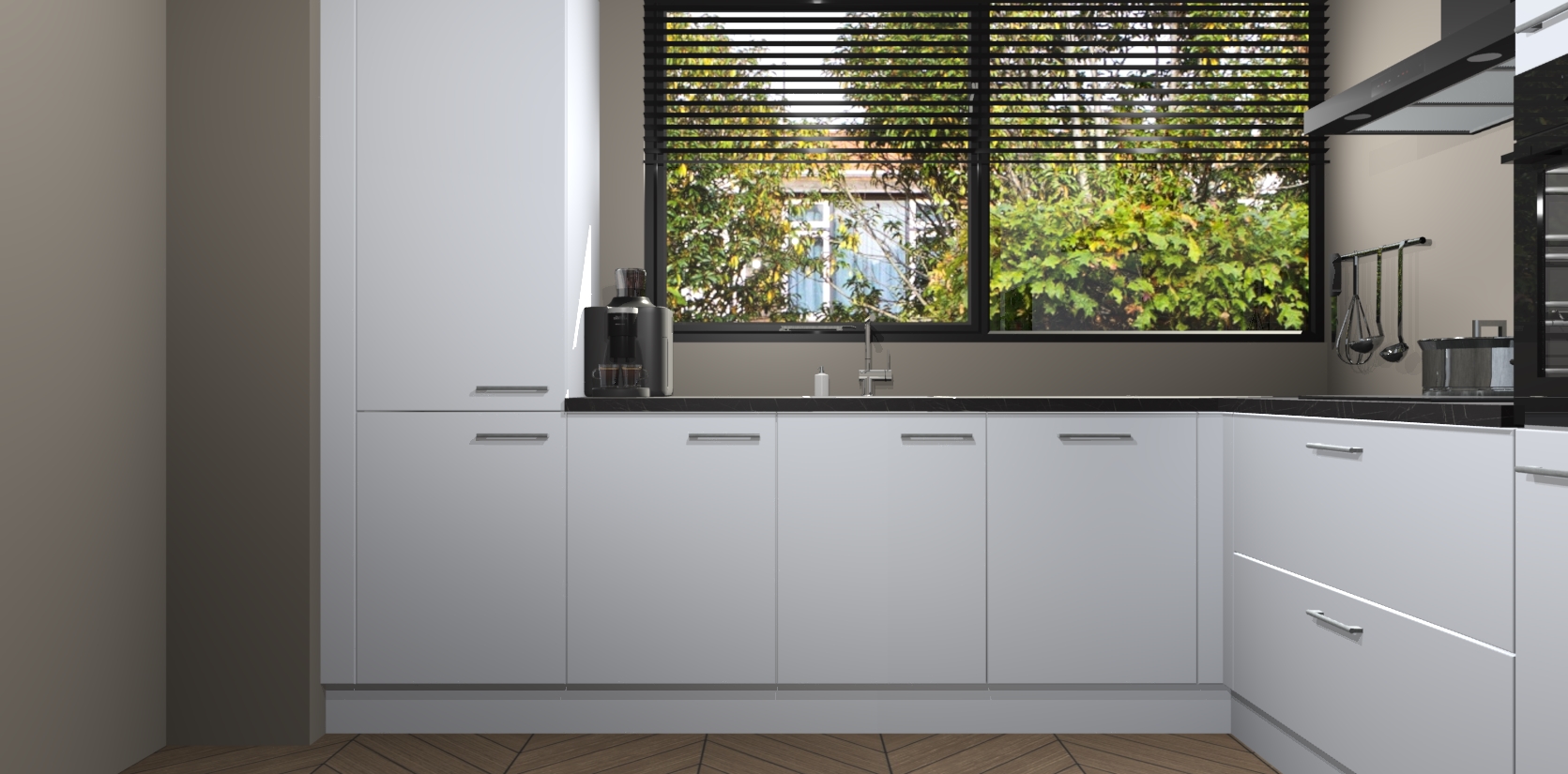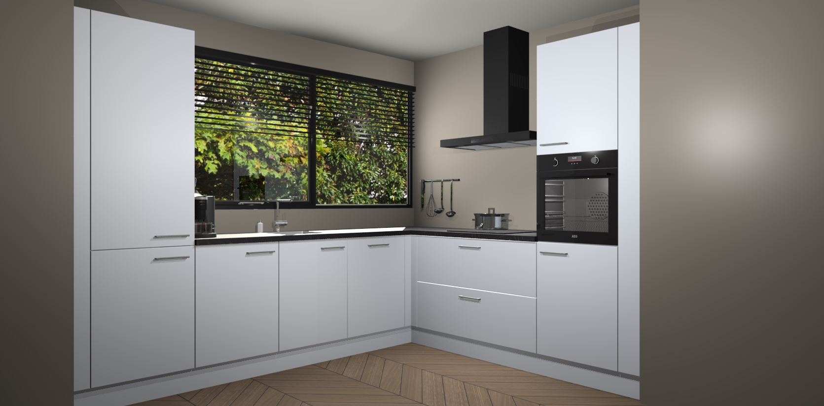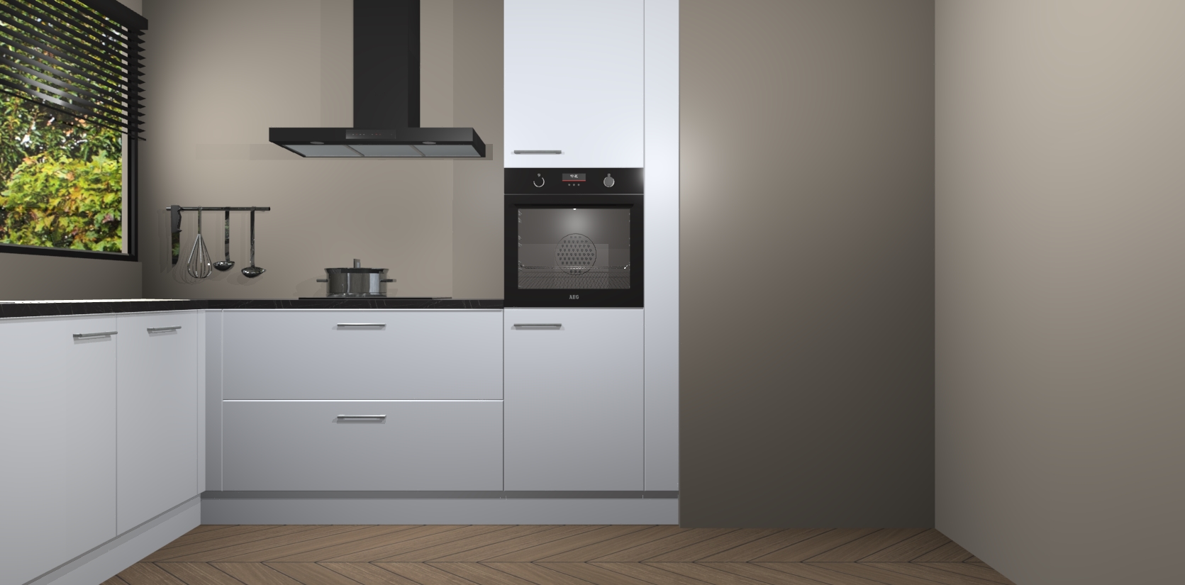 Met een modern, tijdloos design en ruime opslagruimte, zult u zich in no-time thuis voelen in uw nieuwe keuken. Uw leven wordt eenvoudiger met de soft-close deuren die voor het ultieme stille comfort zorgen - geen geluid dat u stoort terwijl u kookt. Ook is de keuken voorzien van 5 ingebouwde apparaten: een oven, inductie kookplaat, afzuigkap, vaatwasser en koelkast. Deze kunnen gemakkelijk na bestelling worden bijgewerkt naar AEG - waardoor uw luxe ervaring compleet is.