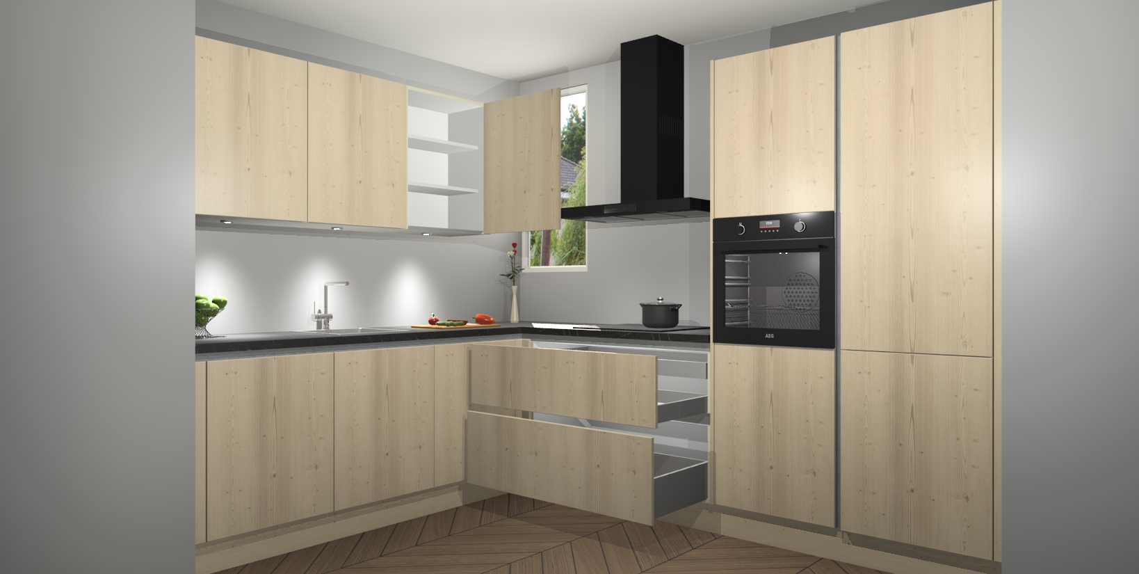 De ruime opbergruimte van dit model maakt het bereiden van voedsel en het gebruik van apparaten snel en gemakkelijk. Het beste van alles is dat het wordt geleverd met vijf inbouwapparaten: een oven, inductiekookplaat, afzuigkap, vaatwasser en koelkast - die allemaal gemakkelijk kunnen worden opgewaardeerd naar AEG na aankoop. Wat de gemaksfactor nog groter maakt, is het feit dat alle cabines voorgemonteerd worden geleverd, zodat u er meteen mee aan de slag kunt!