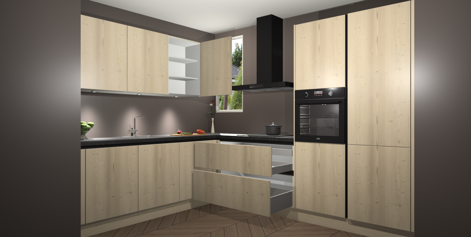 De ruime opbergruimte van dit model maakt het bereiden van voedsel en het gebruik van apparaten snel en gemakkelijk. Het beste van alles is dat het wordt geleverd met vijf inbouwapparaten: een oven, inductiekookplaat, afzuigkap, vaatwasser en koelkast - die allemaal gemakkelijk kunnen worden opgewaardeerd naar AEG na aankoop. Wat de gemaksfactor nog groter maakt, is het feit dat alle cabines voorgemonteerd worden geleverd, zodat u er meteen mee aan de slag kunt!