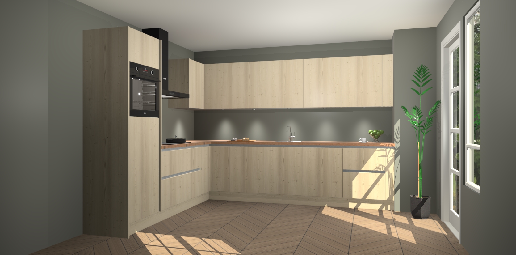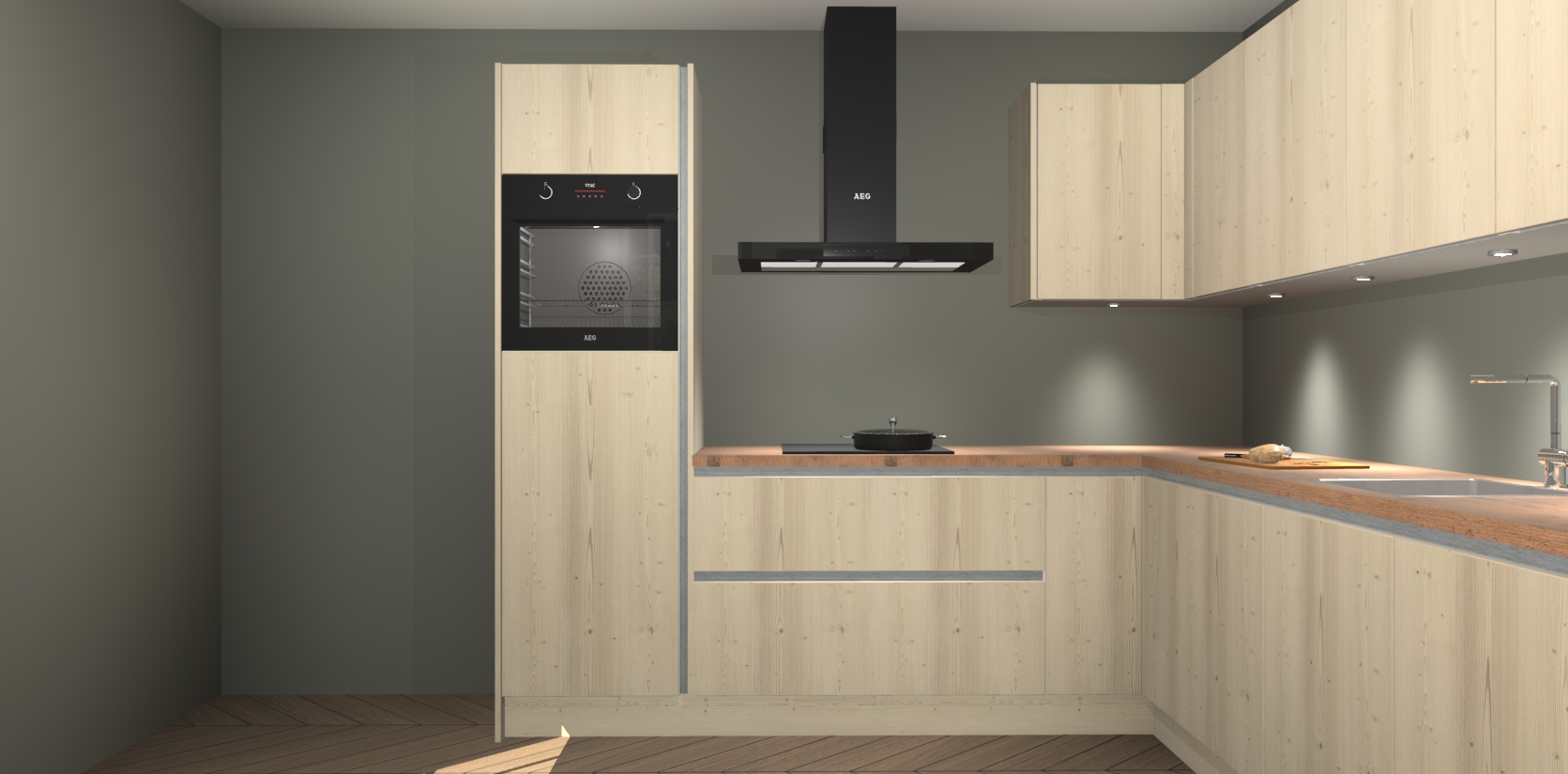 De Vuren greeploze keuken Debar is uitgerust met vijf inbouwapparaten die elke kooktaak handig en efficiënt maken. Een oven, inductiekookplaat, afzuigkap, vaatwasser en koelkast zijn standaard, maar kunnen na bestelling eenvoudig worden geupgrade naar AEG. Profiteer vervolgens van de softclose deuren voor snelle toegang en geruisloze toegang.