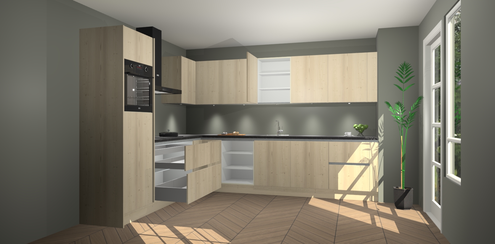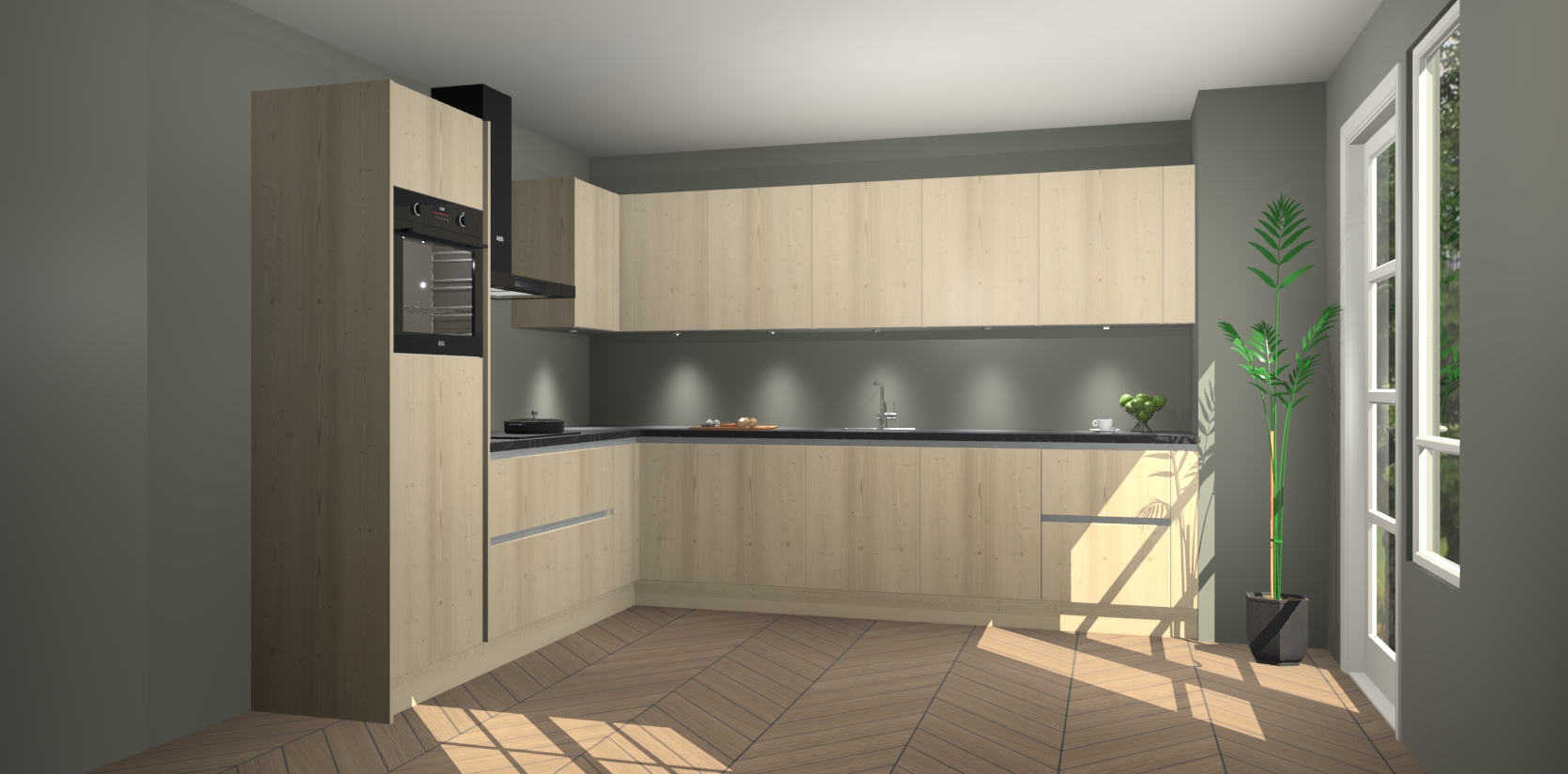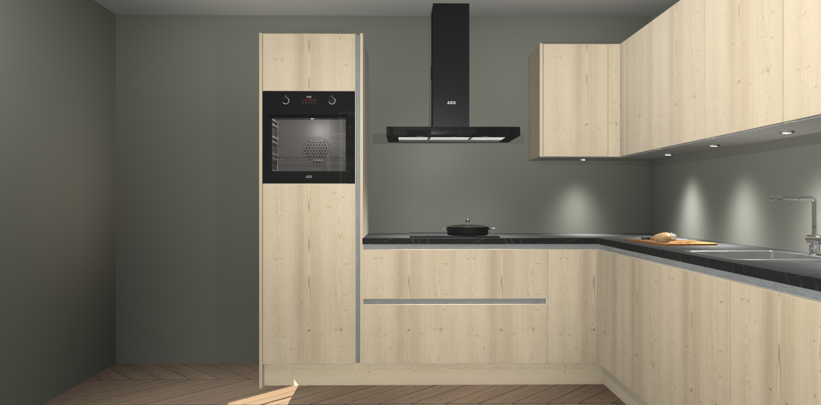 De Vuren greeploze keuken Debar is uitgerust met vijf inbouwapparaten die elke kooktaak handig en efficiënt maken. Een oven, inductiekookplaat, afzuigkap, vaatwasser en koelkast zijn standaard, maar kunnen na bestelling eenvoudig worden geupgrade naar AEG. Profiteer vervolgens van de softclose deuren voor snelle toegang en geruisloze toegang.