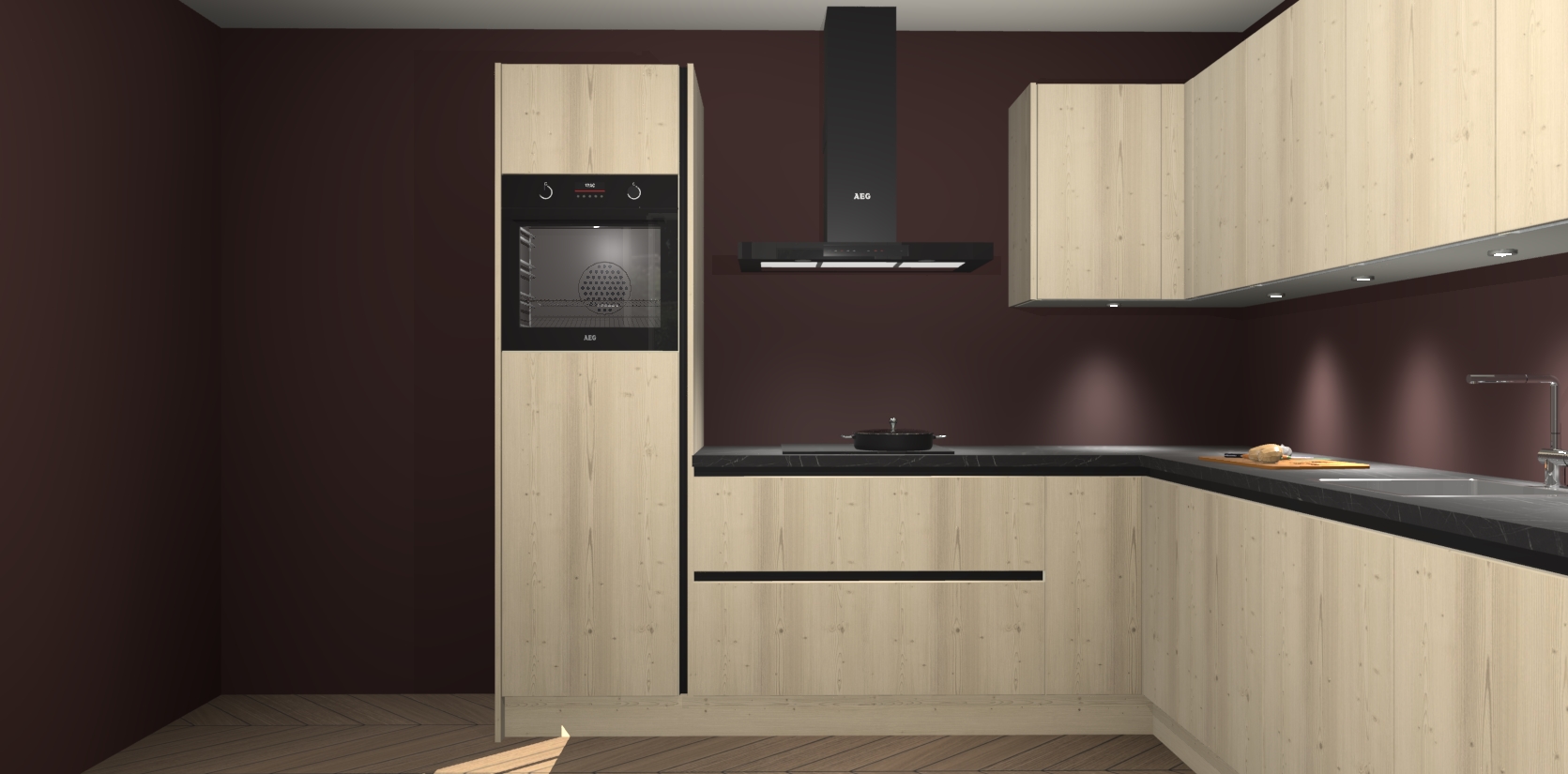 De Vuren greeploze keuken Debar is uitgerust met vijf inbouwapparaten die elke kooktaak handig en efficiënt maken. Een oven, inductiekookplaat, afzuigkap, vaatwasser en koelkast zijn standaard, maar kunnen na bestelling eenvoudig worden geupgrade naar AEG. Profiteer vervolgens van de softclose deuren voor snelle toegang en geruisloze toegang.