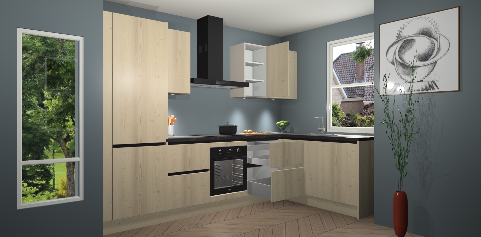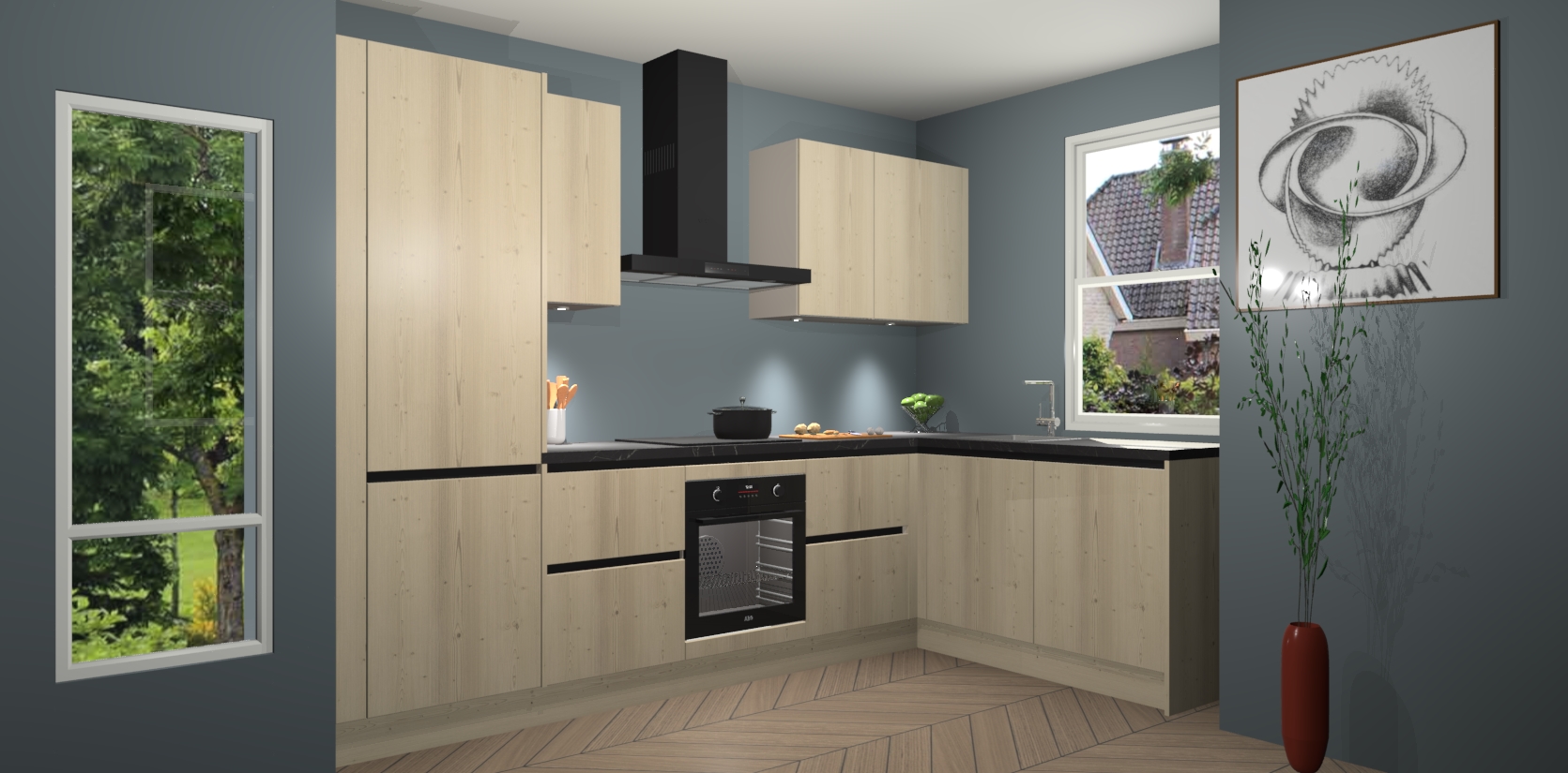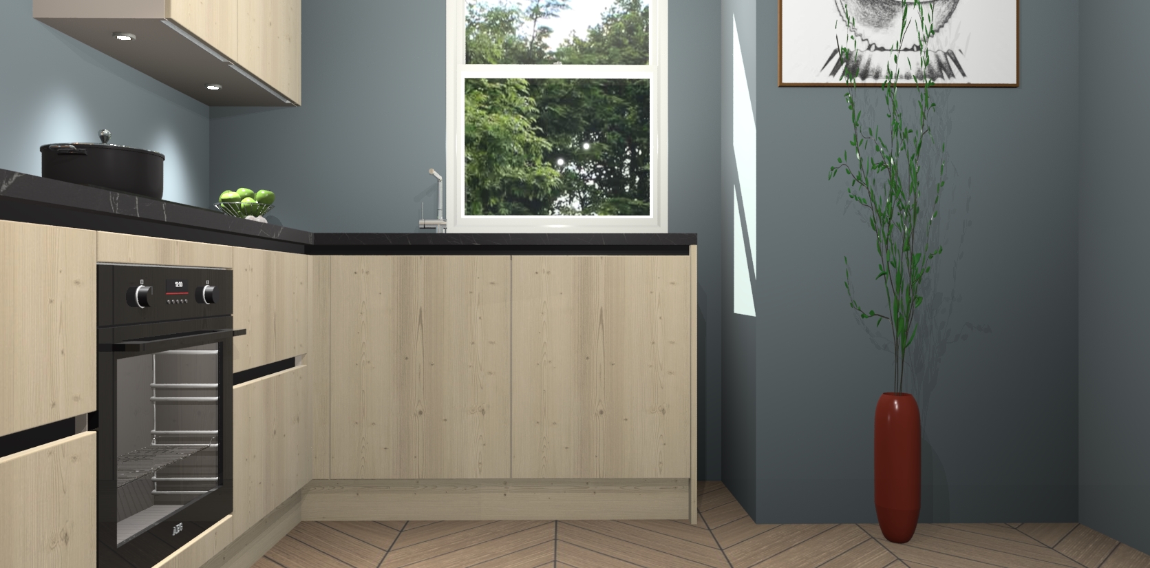 De Vuren greeploze keuken Geneve is uitgerust met 5 inbouwapparaten - een oven, inductiekookplaat, afzuigkap, vaatwasser en koelkast - voor al uw kook- en bewaarbehoeftes. U kunt deze apparaten desgewenst eenvoudig upgraden naar AEG of de oven omruilen voor een combimagnetron na het plaatsen van uw bestelling. En met de soft close deuren, voldoende opbergruimte en kasten die voorgemonteerd worden geleverd, bent u in een mum van tijd klaar om heerlijke maaltijden te bereiden!