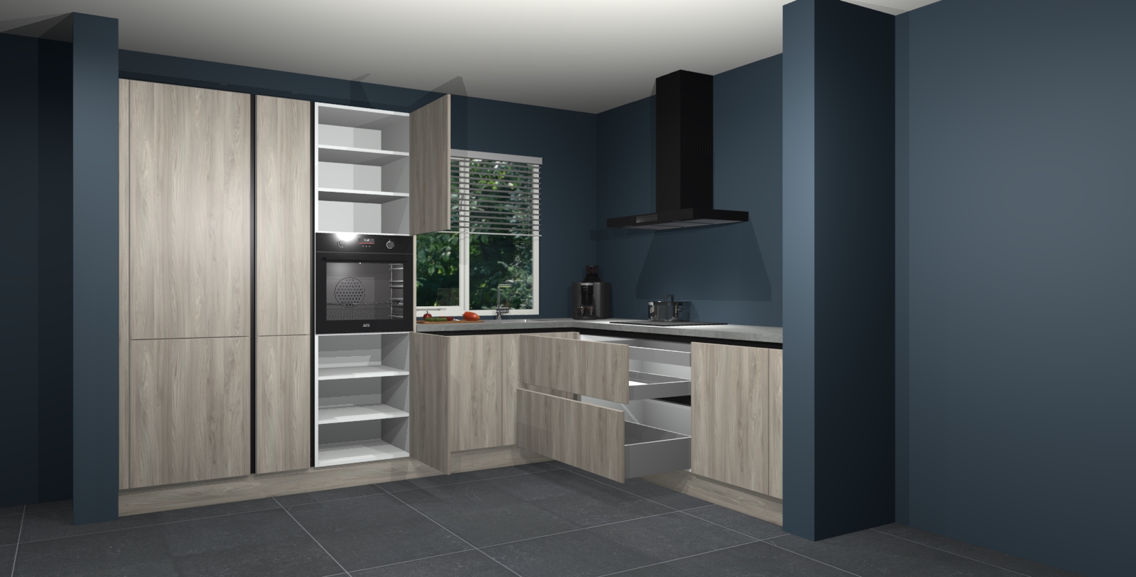 Met een modern, tijdloos design en ruime opslagruimte, zult u zich in no-time thuis voelen in uw nieuwe keuken. Uw leven wordt eenvoudiger met de soft-close deuren die voor het ultieme stille comfort zorgen - geen geluid dat u stoort terwijl u kookt. Ook is de keuken voorzien van 5 ingebouwde apparaten: een oven, inductie kookplaat, afzuigkap, vaatwasser en koelkast. Deze kunnen gemakkelijk na bestelling worden bijgewerkt naar AEG - waardoor uw luxe ervaring compleet is.