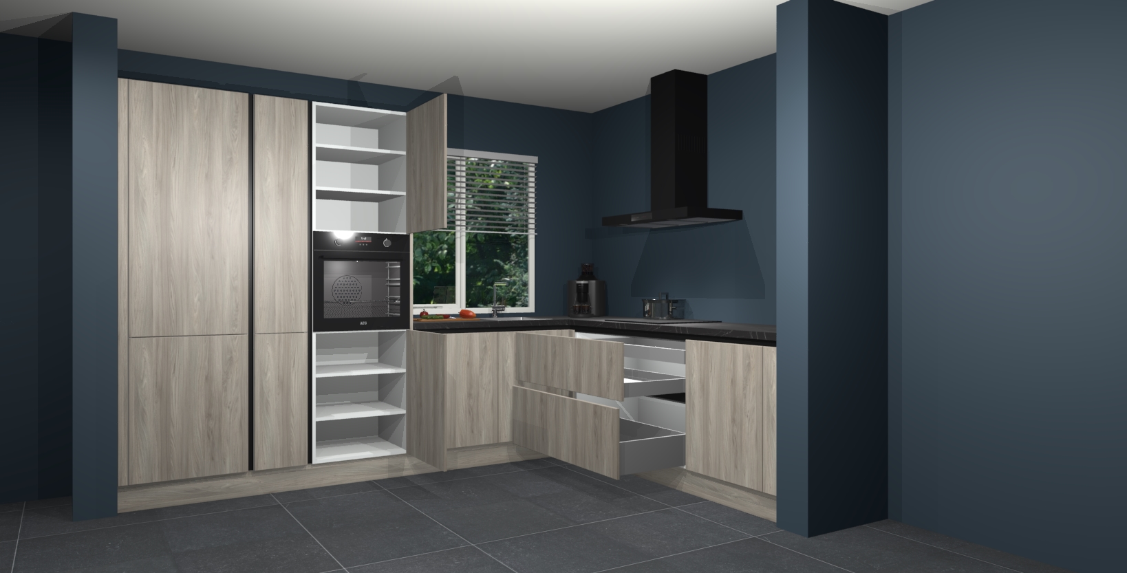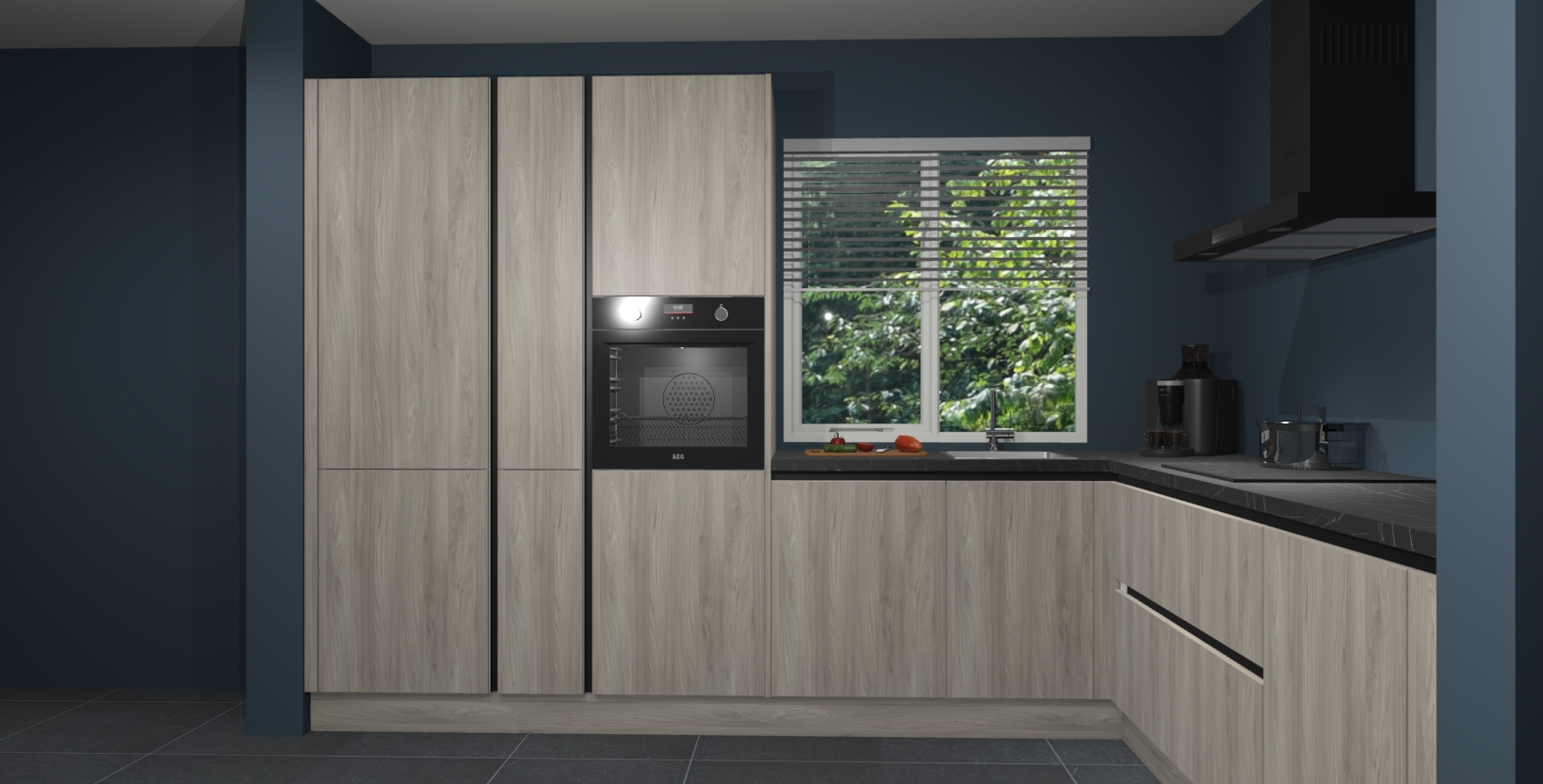Met een modern, tijdloos design en ruime opslagruimte, zult u zich in no-time thuis voelen in uw nieuwe keuken. Uw leven wordt eenvoudiger met de soft-close deuren die voor het ultieme stille comfort zorgen - geen geluid dat u stoort terwijl u kookt. Ook is de keuken voorzien van 5 ingebouwde apparaten: een oven, inductie kookplaat, afzuigkap, vaatwasser en koelkast. Deze kunnen gemakkelijk na bestelling worden bijgewerkt naar AEG - waardoor uw luxe ervaring compleet is.
