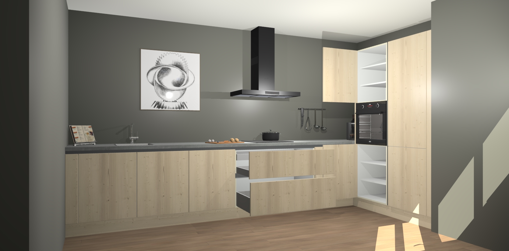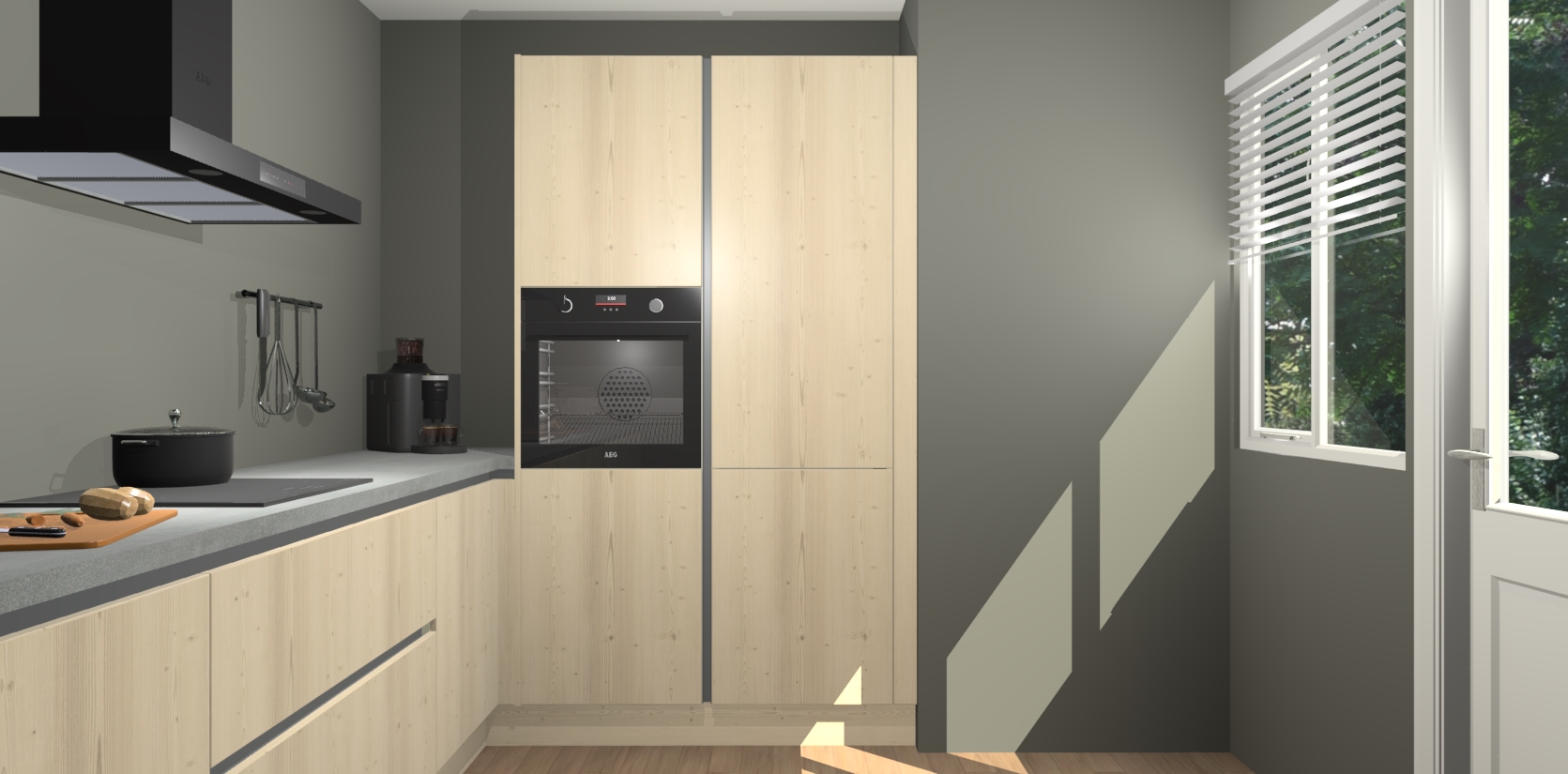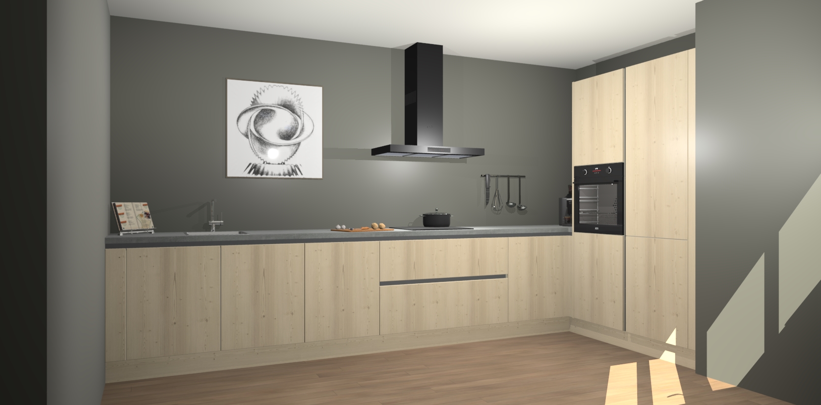 Welkom bij de Vuren greeploze keuken Khao Lak. Deze prachtige keuken zal de komende jaren het middelpunt van de belangstelling in uw huis zijn. Uitgerust met vijf inbouwapparaten komt u nooit kookgereedschap tekort. Bovendien geeft de warme houtlook elke ruimte een uitnodigende en tijdloze uitstraling.