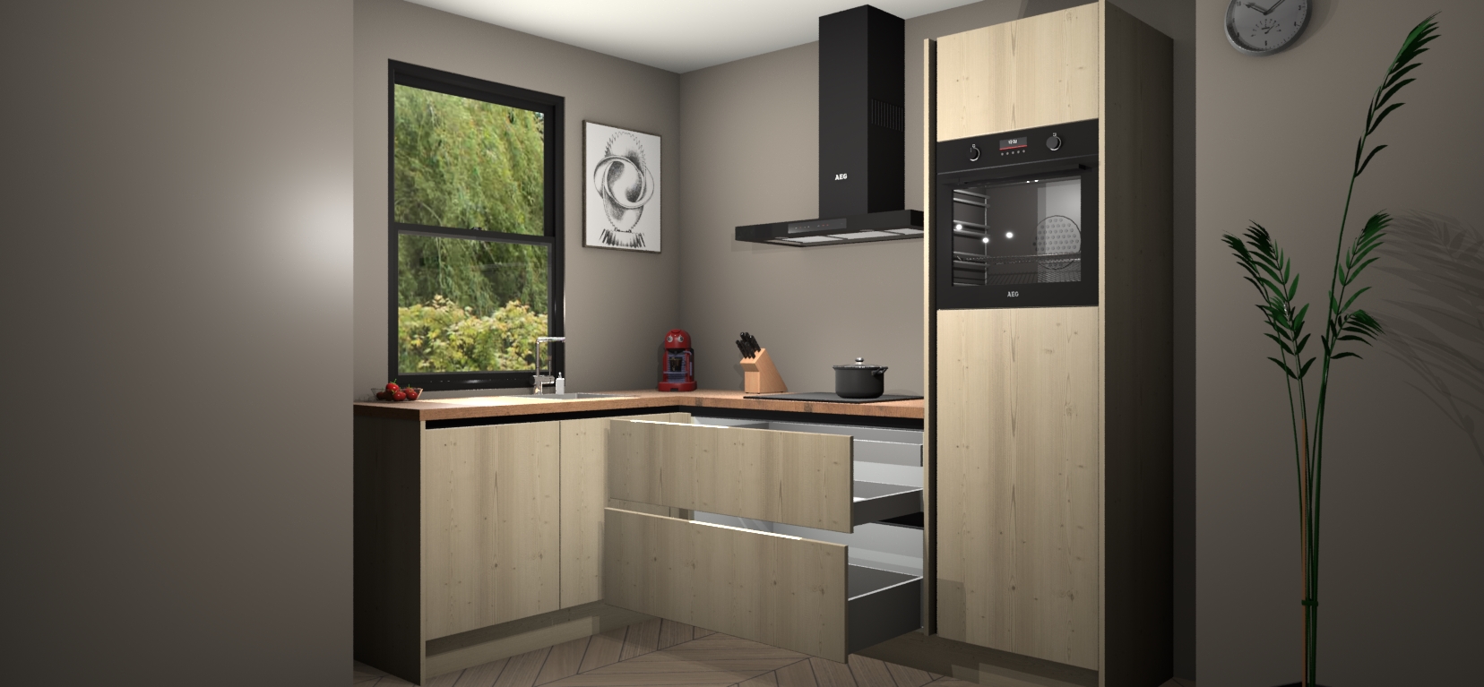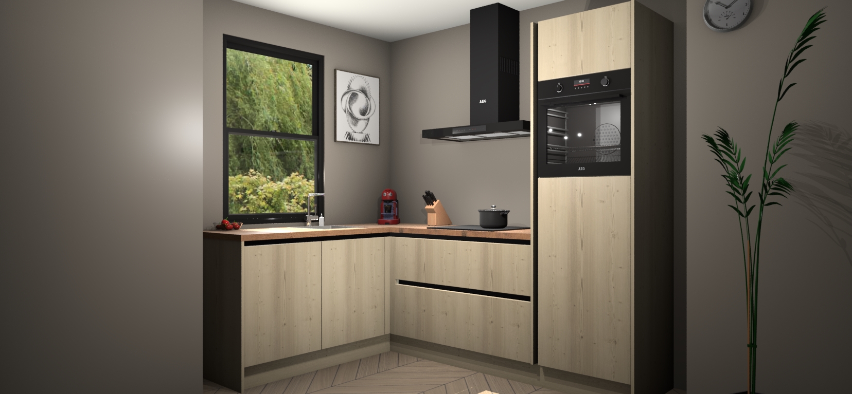 Deze prachtige hoekkeuken heeft alle benodigdheden om uw droomkook- en eetruimte compleet te maken. De Vuren kasten bieden een echo van raffinement, terwijl de 5 inbouwapparaten genoeg opties bieden voor het bereiden van heerlijke maaltijden. De oven, inductiekookplaat, afzuigkap, vaatwasser en koelkast zorgen ervoor dat u tijd in de keuken zo efficiënt mogelijk verloopt, terwijl ze ook dat extra vleugje luxe bieden.