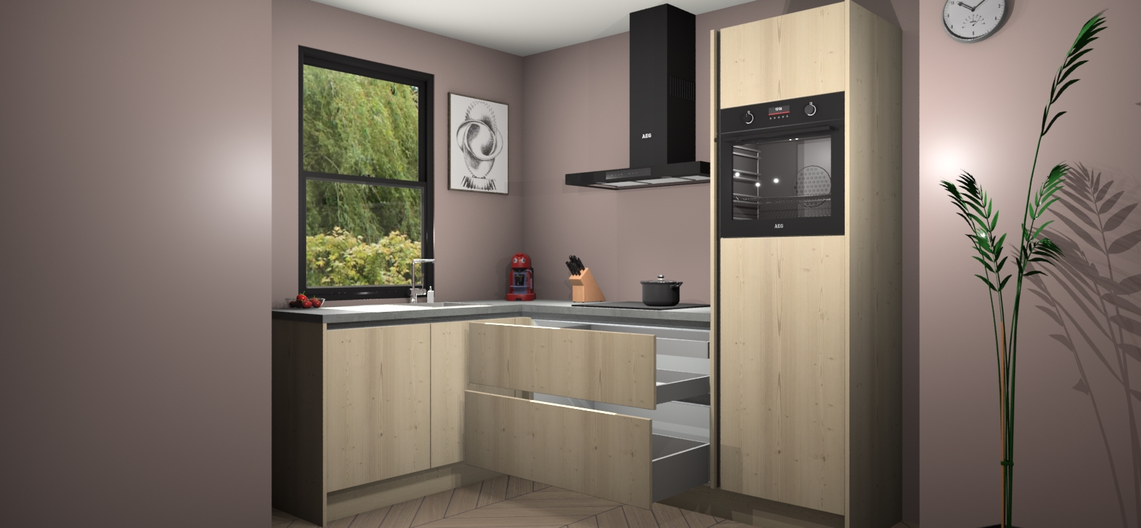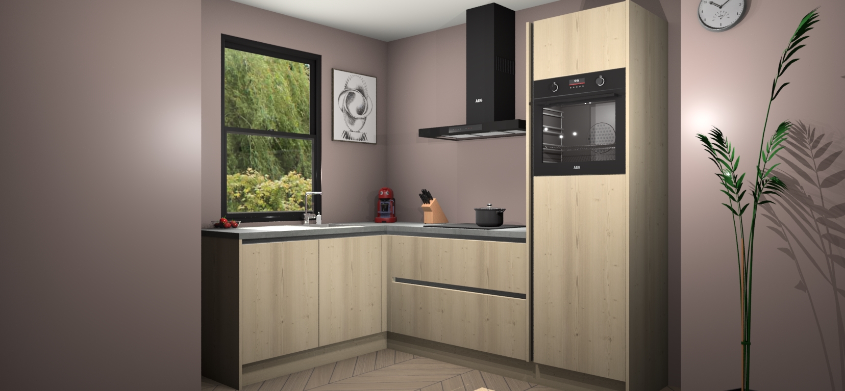 Deze prachtige hoekkeuken heeft alle benodigdheden om uw droomkook- en eetruimte compleet te maken. De Vuren kasten bieden een echo van raffinement, terwijl de 5 inbouwapparaten genoeg opties bieden voor het bereiden van heerlijke maaltijden. De oven, inductiekookplaat, afzuigkap, vaatwasser en koelkast zorgen ervoor dat u tijd in de keuken zo efficiënt mogelijk verloopt, terwijl ze ook dat extra vleugje luxe bieden.