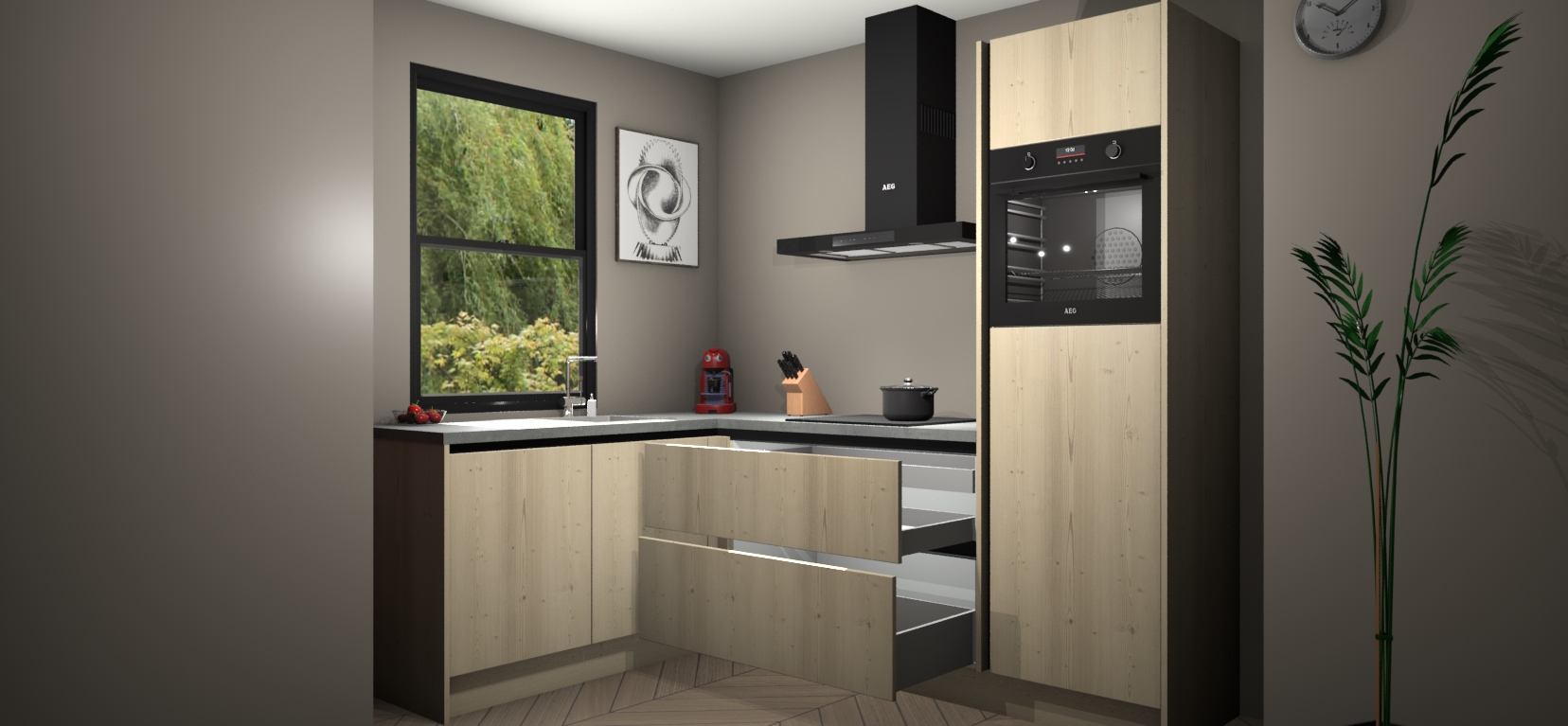 Deze prachtige hoekkeuken heeft alle benodigdheden om uw droomkook- en eetruimte compleet te maken. De Vuren kasten bieden een echo van raffinement, terwijl de 5 inbouwapparaten genoeg opties bieden voor het bereiden van heerlijke maaltijden. De oven, inductiekookplaat, afzuigkap, vaatwasser en koelkast zorgen ervoor dat u tijd in de keuken zo efficiënt mogelijk verloopt, terwijl ze ook dat extra vleugje luxe bieden.