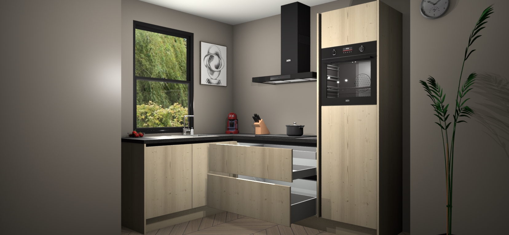 Deze prachtige hoekkeuken heeft alle benodigdheden om uw droomkook- en eetruimte compleet te maken. De Vuren kasten bieden een echo van raffinement, terwijl de 5 inbouwapparaten genoeg opties bieden voor het bereiden van heerlijke maaltijden. De oven, inductiekookplaat, afzuigkap, vaatwasser en koelkast zorgen ervoor dat u tijd in de keuken zo efficiënt mogelijk verloopt, terwijl ze ook dat extra vleugje luxe bieden.