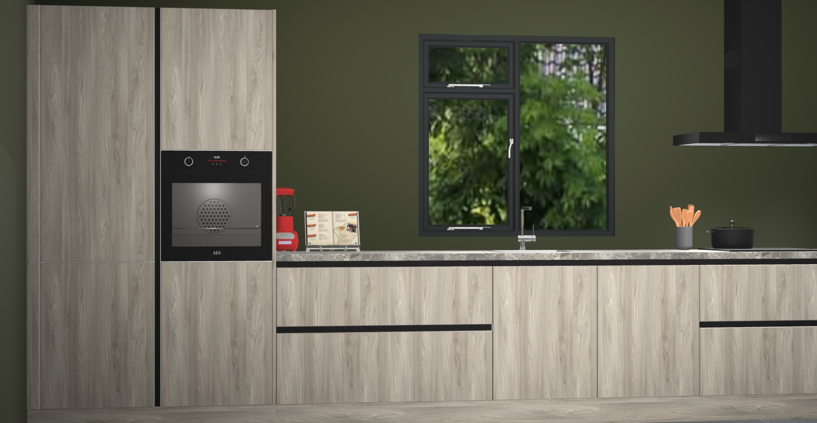 De Vuren keuken Lille wordt geleverd met vijf inbouwapparaten - een oven, inductiekookplaat, afzuigkap, vaatwasser en koelkast. Maar dat is nog niet alles! Na bestelling kunnen deze apparaten eenvoudig worden geüpgraded naar premium AEG-apparatuur. Bovendien is er zelfs de optie om de oven te vervangen door een combimagnetron of uw inductiekookplaat te vervangen door een kookplaat met geïntegreerde afzuiging.