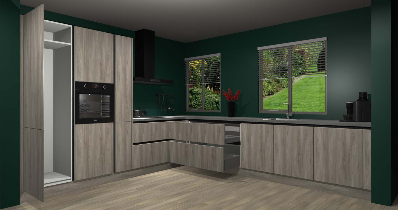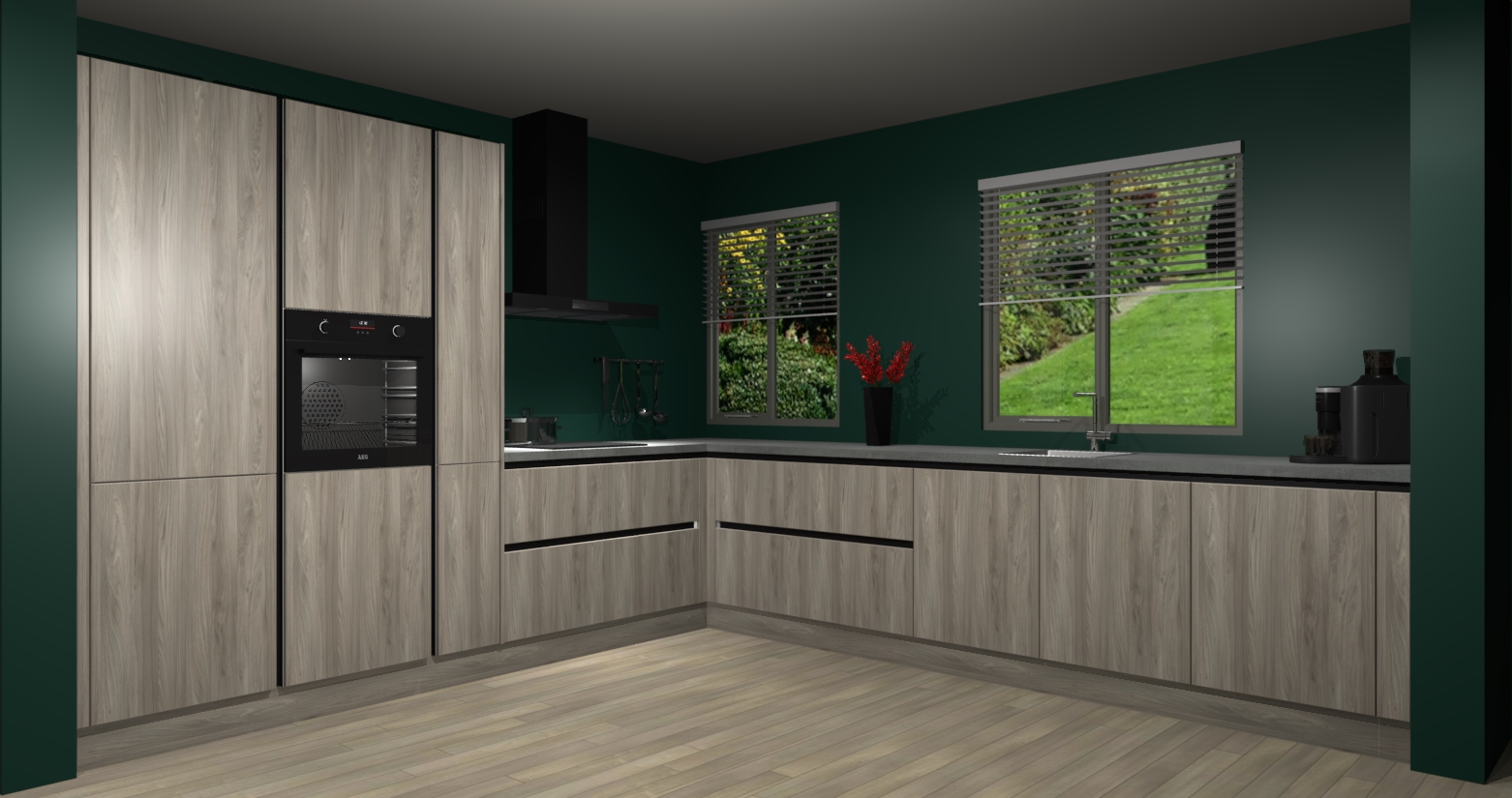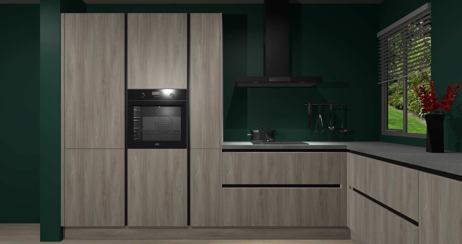 Welkom bij de Vuren keuken Palermo. Deze prachtige keuken zal de komende jaren het middelpunt van de belangstelling in uw huis zijn. Uitgerust met vijf inbouwapparaten komt u nooit kookgereedschap tekort. Bovendien geeft de warme houtlook elke ruimte een uitnodigende en tijdloze uitstraling.