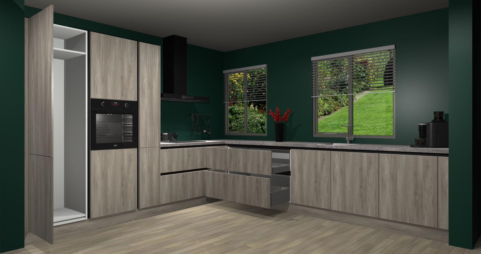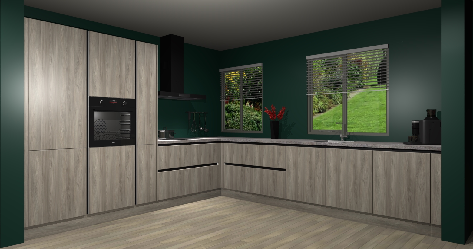 Welkom bij de Vuren keuken Palermo. Deze prachtige keuken zal de komende jaren het middelpunt van de belangstelling in uw huis zijn. Uitgerust met vijf inbouwapparaten komt u nooit kookgereedschap tekort. Bovendien geeft de warme houtlook elke ruimte een uitnodigende en tijdloze uitstraling.