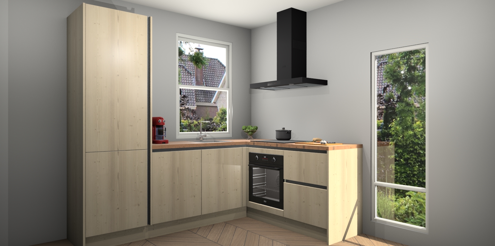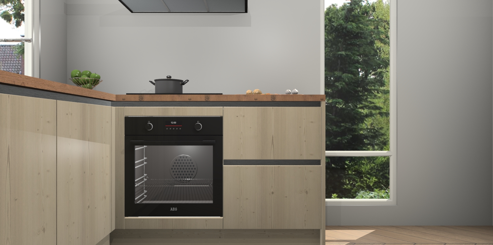 De Vuren greeploze keuken Phuket heeft alles wat u maar kunt wensen. Niet alleen zijn er softclose deuren, maar ook 5 ingebouwde apparaten: een oven, inductiekookplaat, afzuigkap, vaatwasser en koelkast - waarbij u later gemakkelijk naar het AEG merk, van inductiekookplaat naar kookplaat met geïntegreerde afzuiging of van oven naar combimagnetron kunt upgraden. Dat alles tegen een vast laag tarief! Bovendien geeft de Vuren greeploze keuken Phuket supersnelle levering van 7 weken. Echt iets voor u als u er niet op wilt wachten om het resultaat te zien in eigen keuken!